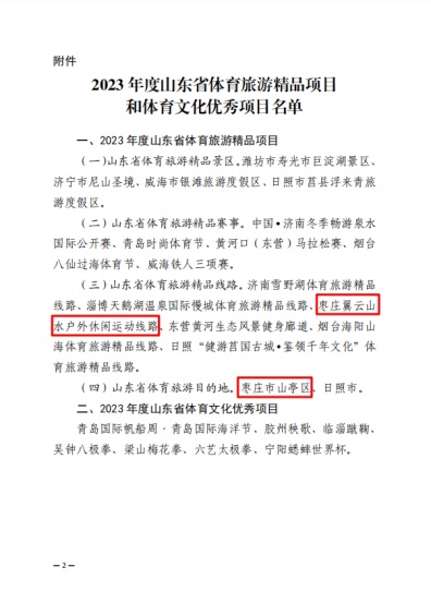 近日,从省体育局《关于命名2023年度山东省体育旅游精品项目和体育文化优秀项目的通知》获悉,枣庄市山亭区、枣庄翼云山水户外休闲运动线路分别获评山东省体育旅游目的地、山东省体育旅游精品线路。