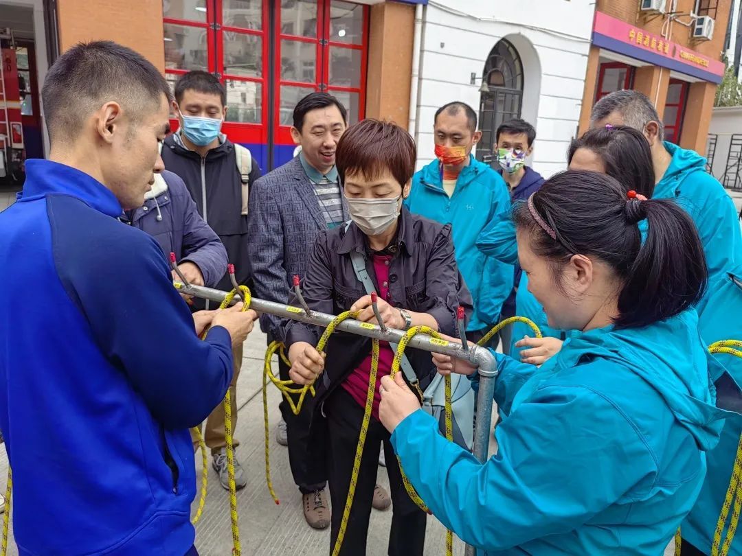 ▲四川北路街道阳光之家学员和老师在消防员指导下练习打绳结。