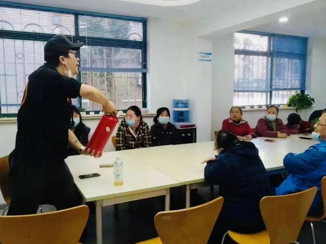 ▲在欧阳路街道阳光之家,社工现场为学员讲解灭火器的使用方法。