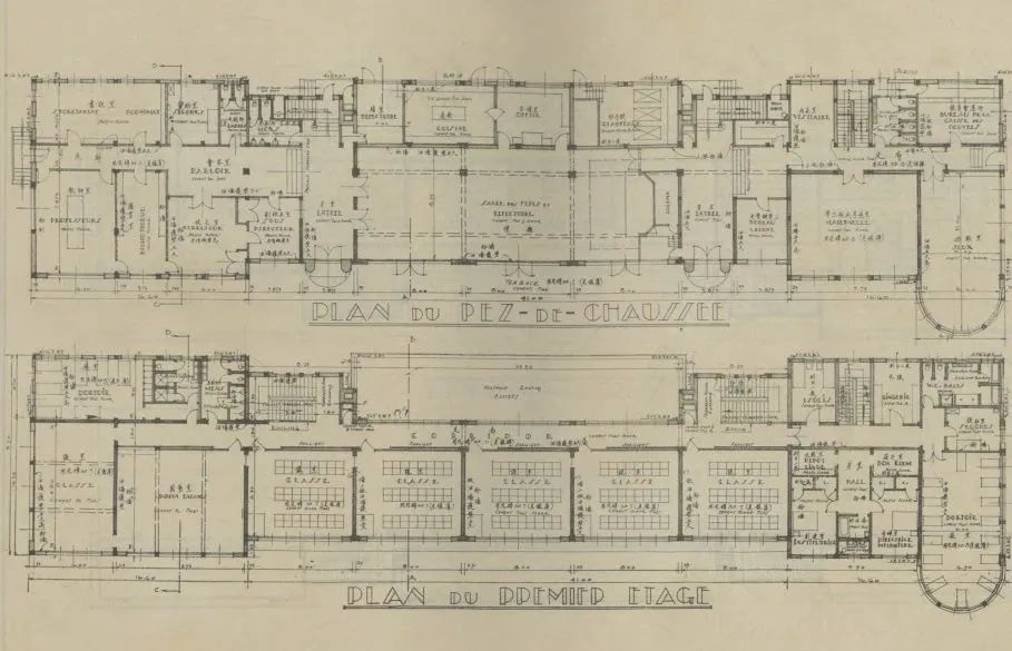 雷米小学由法国公益慈善会于1932年创办,1933年搬入永康路200号的校舍,招收白俄侨童为主。雷米小学教学大楼坐北朝南,钢筋混凝土结构,主体高三层,中部为四层。外立面为现代派风格,主立面(南立面)为左右基本对称的设计,采用了大面积的横向线条和水平窗带,两处入口旁各设有一个八边形的舷窗。平面整体呈现一字型布置,教室、实验室、图书馆、礼堂等均设于各层朝南位置,体现了现代派建筑实用至上,注重功能性的特点。雷米小学一层、二层平面图,来源:《建筑月刊》第一卷第十二期