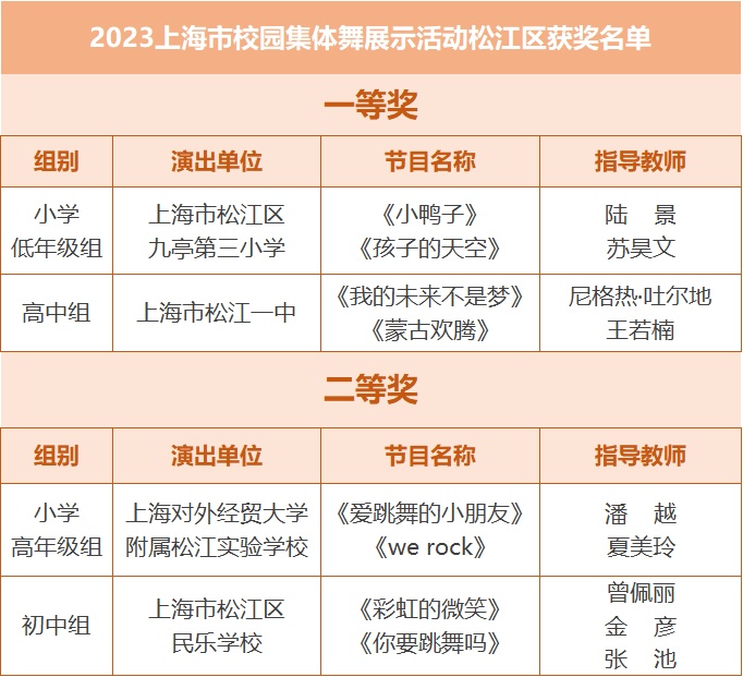 此次展示活动松江区域层面积极筹备,认真组织,在经过培训与推广、初赛与决赛的展示后,最终选送松江区九亭第三小学、上海对外经贸大学附属松江实验学校、松江区民乐学校、松江一中4所学校参加2023上海市校园集体舞的展示活动,并取得优异成绩。松江一中的校园集体舞入选上海市科技艺术教育中心和上海教育电视台主办的“青春正当时——2023学生草地音乐节”展示活动。