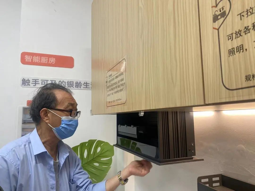 “老人能根据自己的身高和需求,调节厨台高度。”工作人员一边操作,一边解释,“如果家里有坐轮椅的老人,就能把厨台下降到适合他的高度,而且厨台下方是空的,轮椅可以停靠到厨台下方,方便坐轮椅的老人在厨台边洗碗洗菜。”