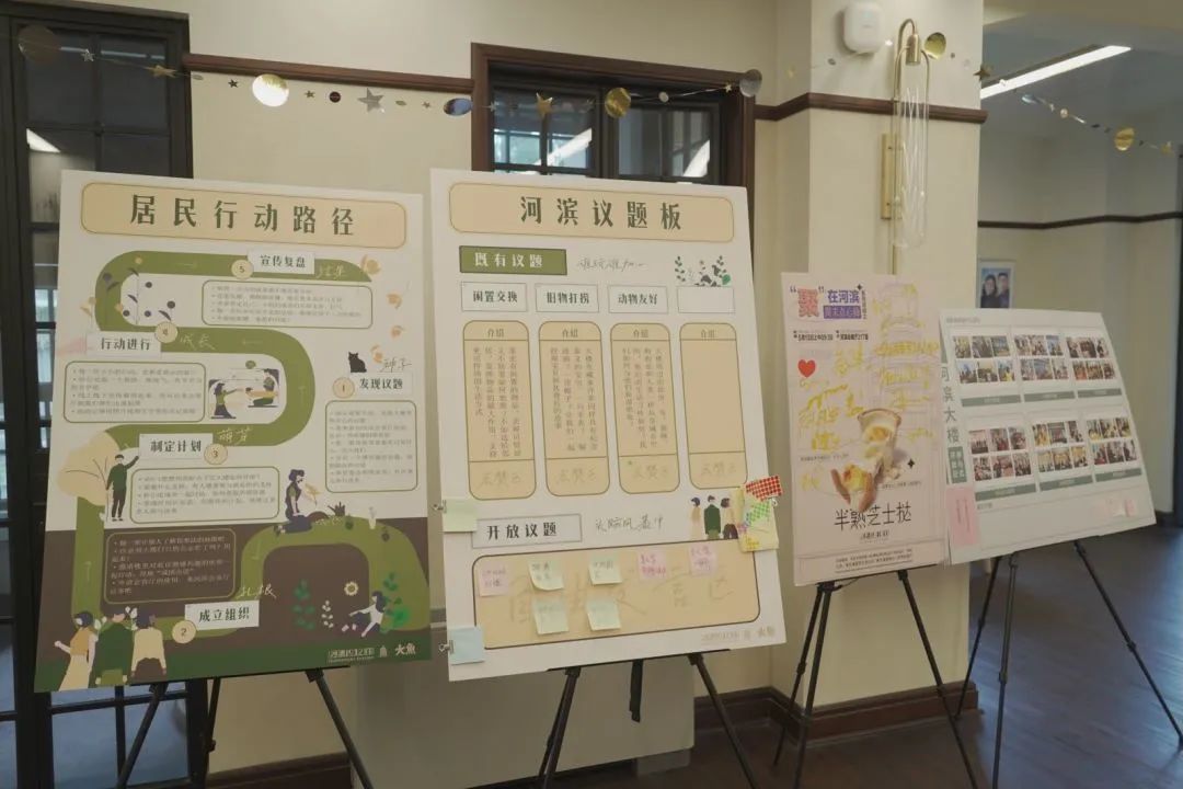 对徐杰而言,河滨会客厅还是推动邻里和周边企事业单位沟通对话的平台载体。在社区交互中,居委干部逐渐从“被动等待”转变为“主动服务”,不断凝聚社区治理共同体。据悉,河滨会客厅已经开发了自有文创产品,如印有河滨大楼logo的矿泉水、咖啡杯等物件,这些创意和产品均由居民自发设计。空间内所有软装装饰,展示河滨大楼及苏州河沿岸发展轨迹和生活场景的书籍、画作、照片也均由居民自发提供。对此,徐杰感到非常自豪:“在这方面,我们没有花一分钱。”