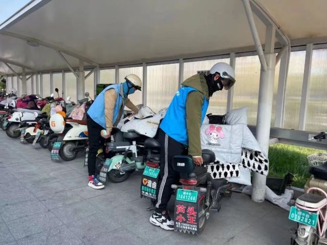 义诊结束后,为进一步发挥新业态新就业群体在文明城市创建工作中的联动纽带作用,提升文明城市程度和公民文明素质,社区志愿者与新业态新就业群体联合行动,对商场附近的乱停乱放进行整治,大家将自行车、电动车搬到规范区域停放,并号召居民自觉维护停车秩序。