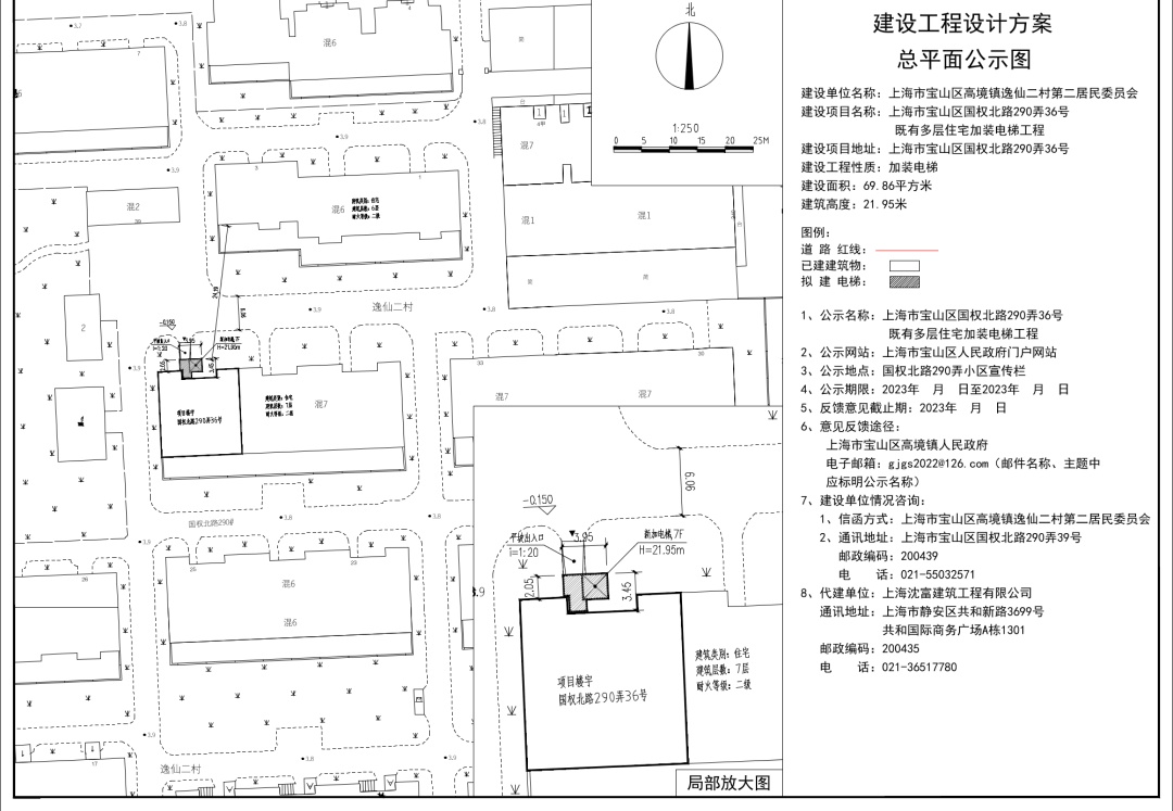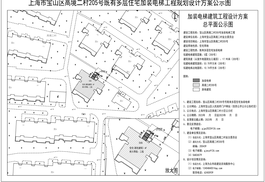 公示网站:宝山区政府门户网站 公示现场地点:高境二村公示栏 公示期限:2023年11月3日至2023年11月12日 反馈意见截止期:2023年11月19日 上海市宝山区高境镇人民政府 电子邮箱:gjgs2022@126.com(邮件名称、主题中应标明公示名称) 信函方式∶上海市宝山区高境二村第二届业主委员会 通讯方式∶上海市宝山区高境二村205号 邮编∶200439 电子邮箱:gjecyj@126.com 联系电话∶021-56826579 上海为众市政建设咨询服务中心 电子邮箱∶1240484051@qq.com 联系电话∶021-62455939 国权北路290、380、460弄36号多层住宅 加装电梯项目设计方案