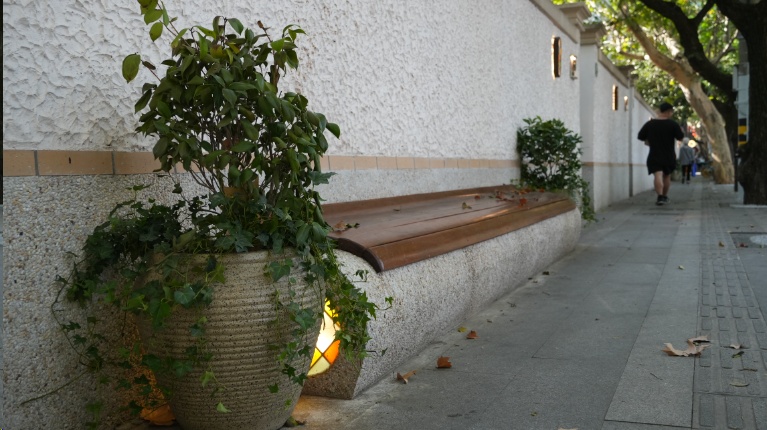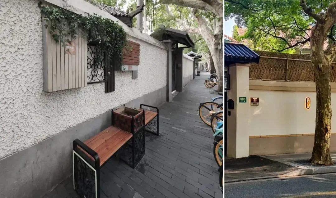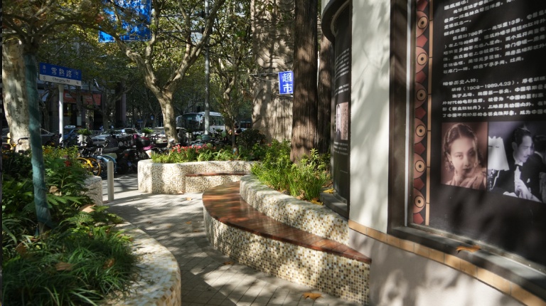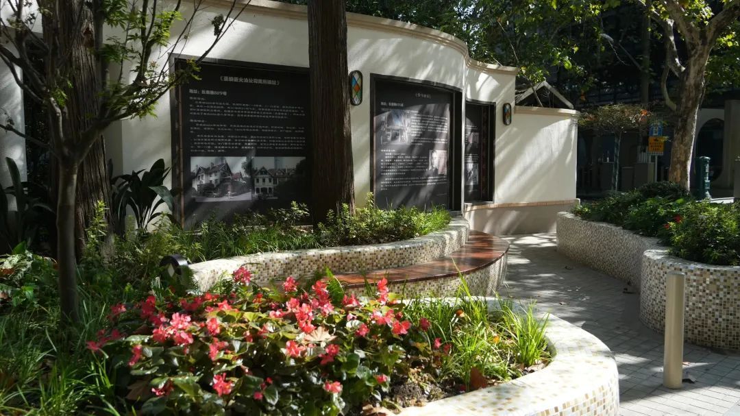 原本单一的花坛被加装了防腐木坐凳、壁灯、草坪灯等贴心便民的配套设施,可供市民在此休憩。后方空荡荡的墙面也成为了展示巨鹿路人文历史故事的载体,常有行人路过时被吸引,驻足静静阅读这段沉淀了一百多年岁月的老上海风云故事。