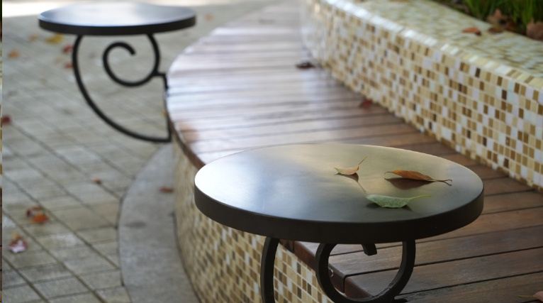 为了将这块绿地空间改造为能够承载行人各式各样需求的复合型城市街角游园,改造项目设计团队用贴上复古马赛克瓷砖的圆拱门和座椅,引导路人走进游园坐下来。与整体复古风格相配的铁艺吧台桌可供路人放一杯咖啡,在树荫之下享受一下午的静谧时光。