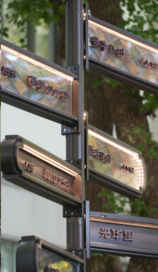 经典的海派拱形门窗、精致的铁艺勾花造型,以及见证了上海近代文化发展史的“巨富长”街区地图,融汇在一起,形成与“巨富长”街区整体风格相统一的复古精致的窗户形态标识。标识选用海派建筑中常见的红砖红,仿佛透过这扇窗,能够见证“巨富长”的历史沉淀。市民表示:“一低头看到树旁边的挡板上有这个logo,感觉这种小细节就很精巧优雅,再往前走又突然看到墙上也印着这个,就感觉自己在‘寻宝’,散步时充满惊喜。”。