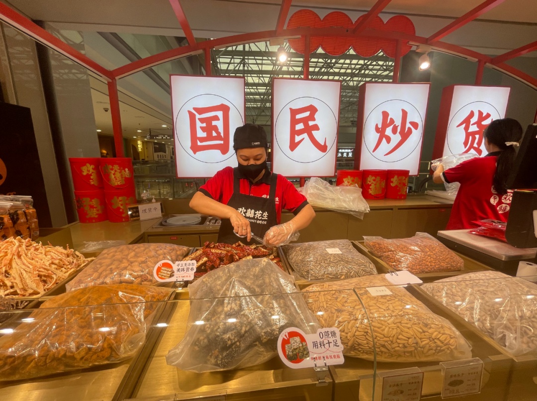 在地铁站内,也有店铺宣传推销高声叫卖着板栗等时令炒货,吸引路人试吃。一位行人停留品尝核桃与瓜子后,购买了原味香瓜子。行人热心地向记者分享:“秋天喜欢磕瓜子呀,消磨消磨时间。”