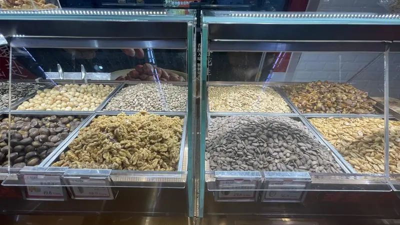 在一些店铺内,瓜子、小核桃、碧根果、板栗、红枣等多种零食都被摆放在显眼的位置,顾客们选择丰富。例如,在国民炒货,现瓜子售价19.8元/500g,碧根果售价51.8元/500g。据店员介绍,这些炒货的价格相对稳定,较去年基本没有变动。店员向记者介绍,小核桃和碧根果都是近日新上市的产品,前几日刚刚到店。由于包装成本和会员优惠幅度不同,不同店铺的价格可能存在差异。