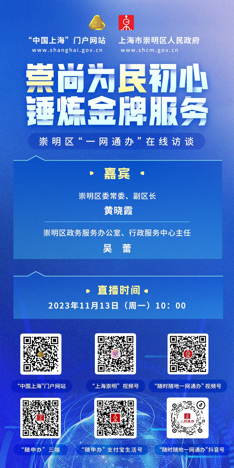 在“一网通办”改革五周年之际,崇明区委常委、副区长黄晓霞,崇明区政务服务办公室、行政服务中心主任吴蕾将于11月13日(周一)上午10点做客“中国上海”门户网站在线访谈,向公众介绍崇明区以“崇尚为民初心 锤炼金牌服务”为引领深化“一网通办”改革的创新举措,展示“瀛洲店小二”在促发展、惠民生、抓治理等方面的实际成效。
