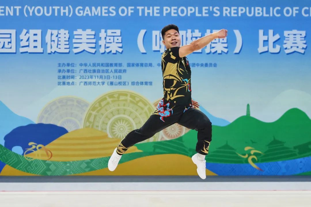 学青会健美操比赛在广西桂林举行,由华东师范大学组队的校园组上海大学生健美操队收获颇丰——冯蕾夺得女子单人赛金牌;健美操男子单人操张庆周夺冠;集体技巧啦啦操夺冠。此外,健美操五人操摘银;刘云松、刘宣晨获混合双人操铜牌;梁文杰、滕浩、范思伟获三人操铜牌。大学生健美操队以3金1银2铜完美收官。目前,中学组健美操和拉拉操比赛还在进行中。