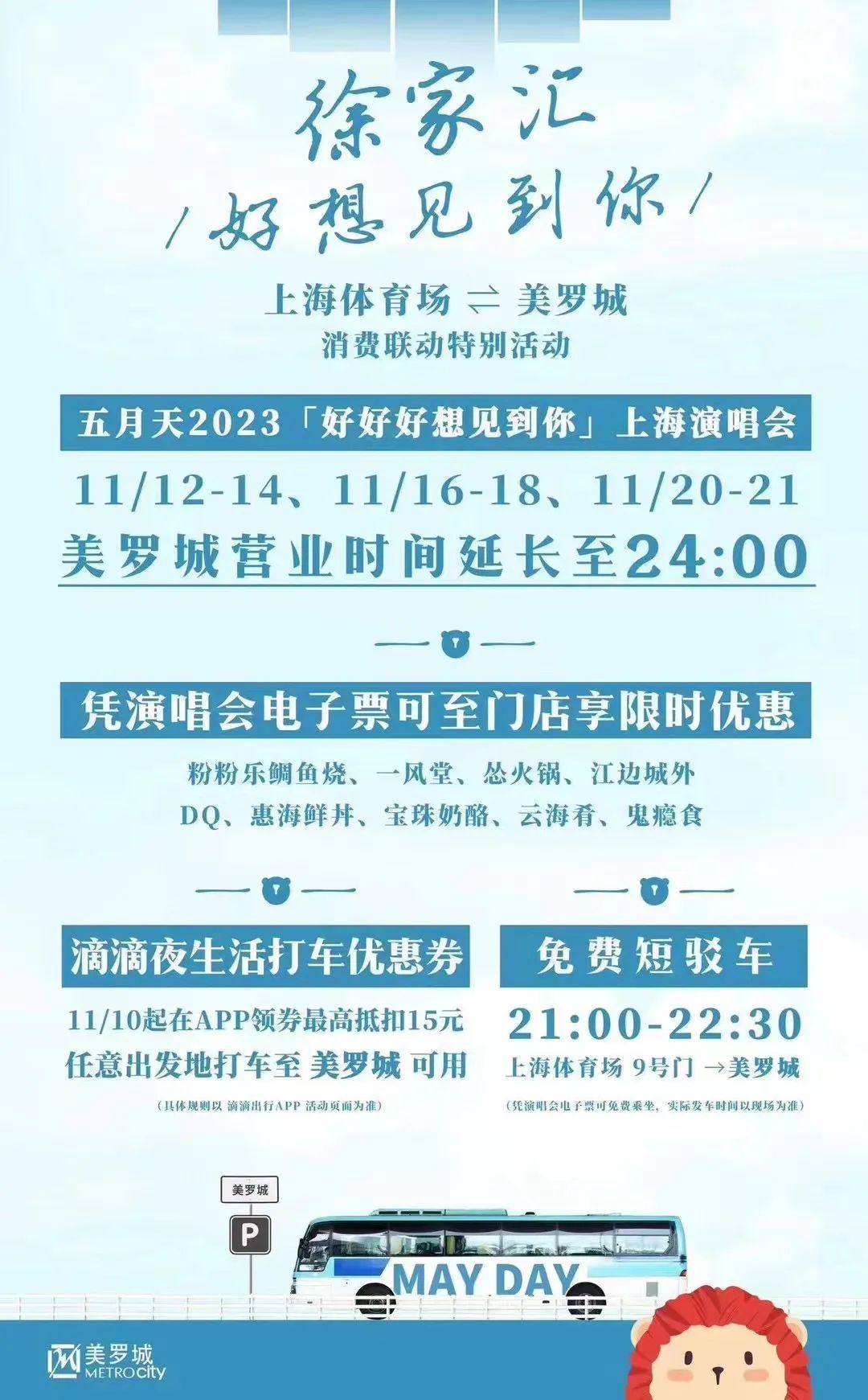 为确保演唱会周边道路交通的安全、有序、畅通,届时会对上海体育场附近道路进行临时交通管控。在演唱会结束后,美罗城贴心安排了专属短驳大巴车,开往T20大厦车道,不仅靠近商场,离1号、9号、11号地铁站也很近!此外,大家可以在“滴滴出行”APP上领券最高抵扣15元,任意出发地打车至美罗城可用。