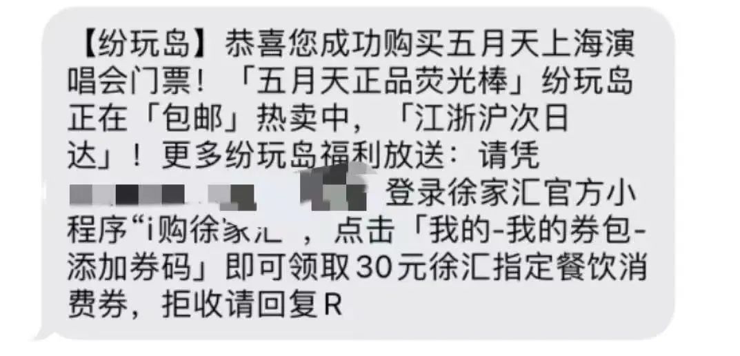 已抢到演唱会票的小伙伴们,如有收到以下短信,可以登录徐家汇官方小程序“i购徐家汇”免费领取1张价值30元的徐汇指定餐饮商户消费券。在演唱会现场也设有活动专用二维码,没有收到短信的粉丝可以扫一扫获得餐饮消费券。美罗城营业时间延长至24:00。