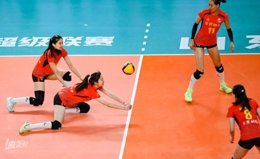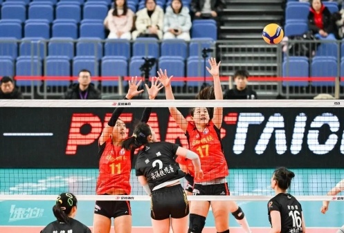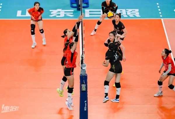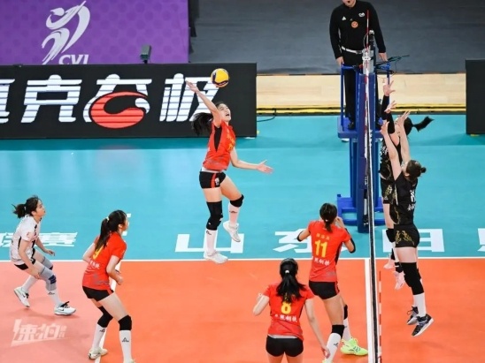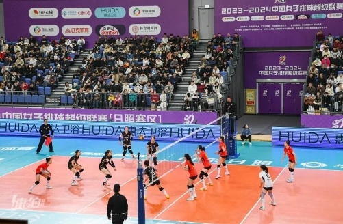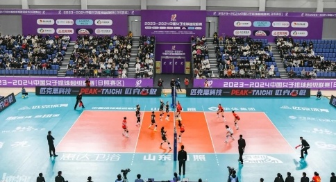 11月11日,2023-2024中国女子排球超级联赛(日照赛区)第三轮17场,山东日照钢铁女排与福建安溪铁观音女排的比赛在日照香河体育公园进行。