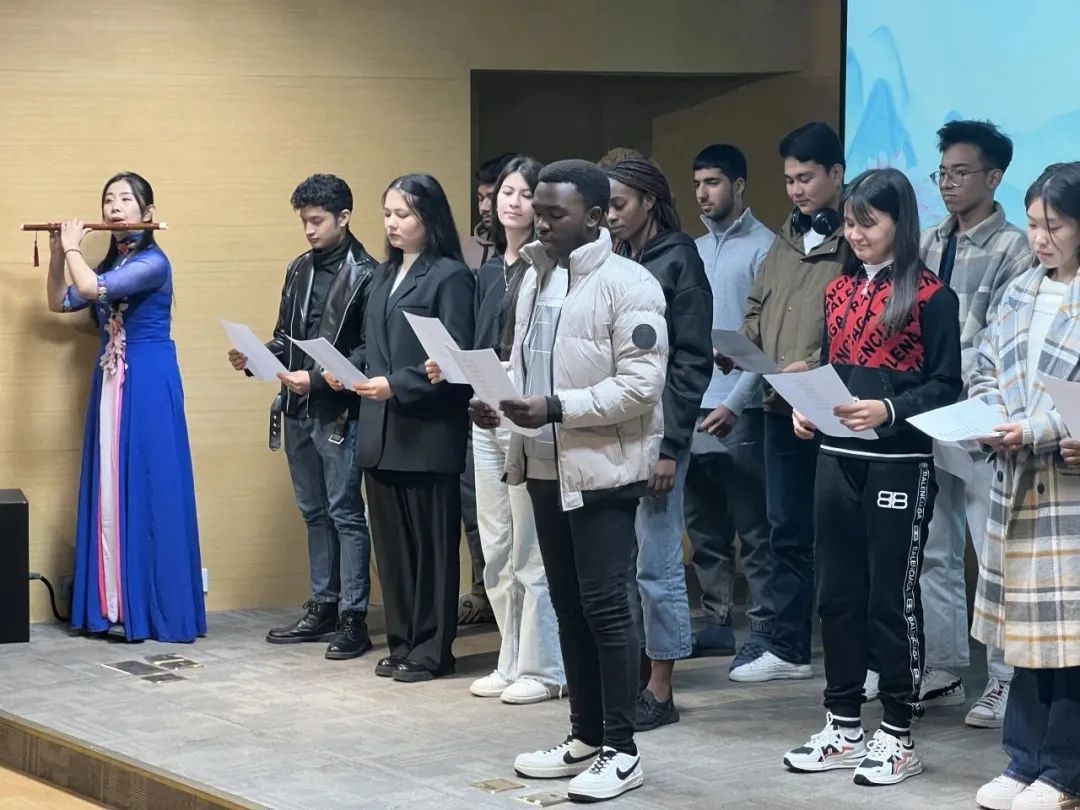 随后,活动还邀请此前在同济大学“故土诗情”经典诵读活动中获奖的学生代表上台朗诵,从唐代李白的《蜀道难》到岳飞的《满江红》,大家个个情绪饱满、慷慨激昂,体现出对诗词的爱好和追求。留学生们自己也登台,带来了一首诗词朗诵《江南》,配合着江南丝竹专业乐手的现场伴奏,别具一番诗情画意。