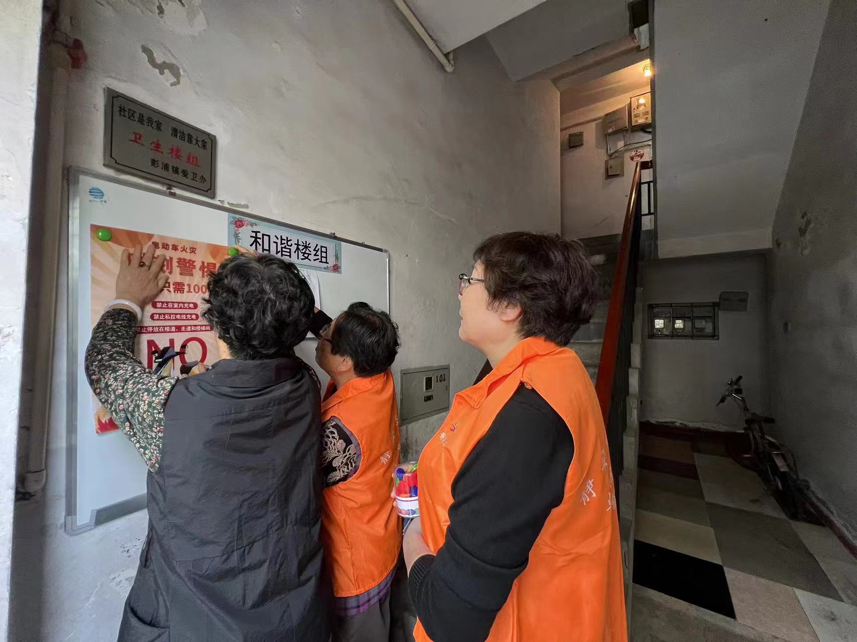 活动当天,这两个支部的党员向居民们普及消防知识,比如楼道内不能堆积杂物、严禁电瓶车在楼道内充电。另外,楼组长和志愿者三、五人一组,分区域为永泉公寓的29幢门栋贴消防海报,宣传楼道内需要注意的消防注意事项。