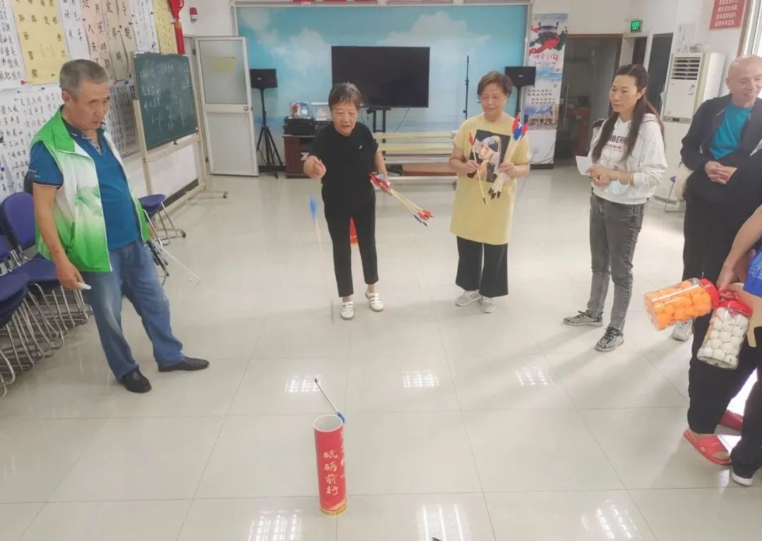 熟悉的“九宫格”,年代感十足的投壶、滚铁环、跳房子、踢毽子、夹弹珠,以及新颖有趣的乒乓接力、篮球大运送、飞行棋大PK……现场,比赛项目“花样”极多,来自辖区的居民和社区企业青年志愿者们热情高涨,组成参赛队伍“各显身手”。