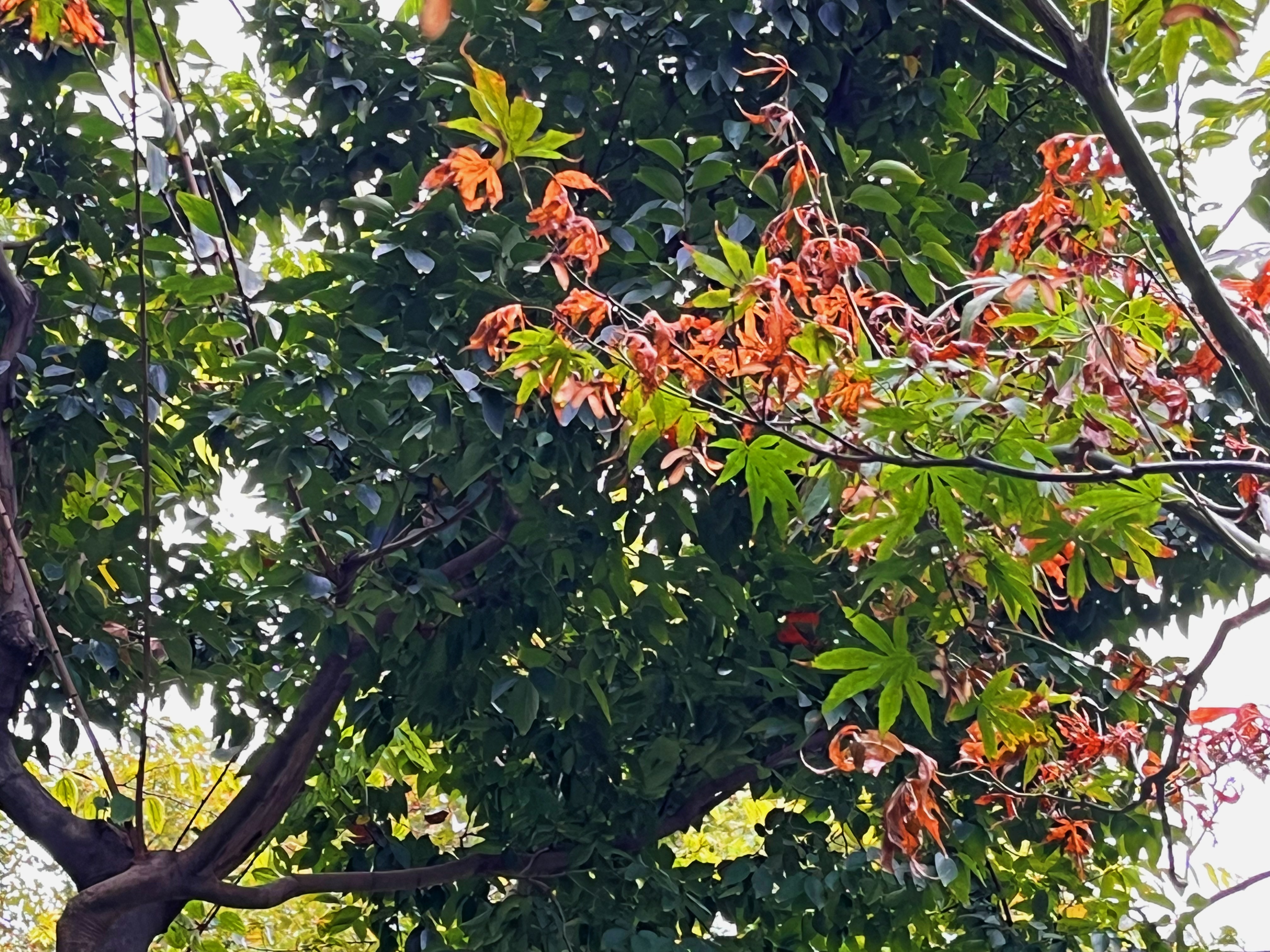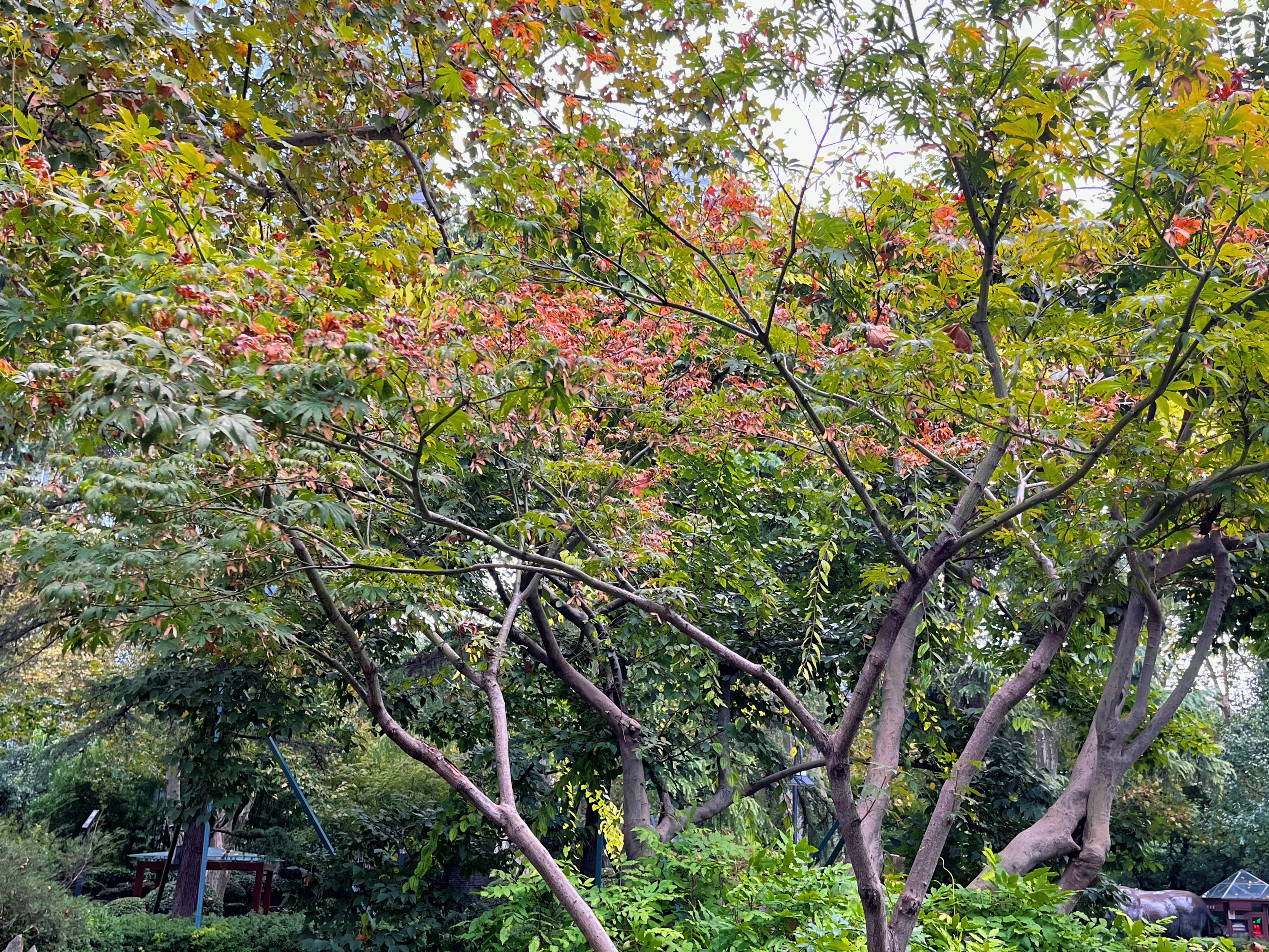 静安公园的红枫每年秋冬都红得鲜艳夺目,吸引不少市民游客前来拍摄打卡。今天,静宝在静安公园看到,几株枫树基本都已是绿叶间点缀上了星星点点的红叶。