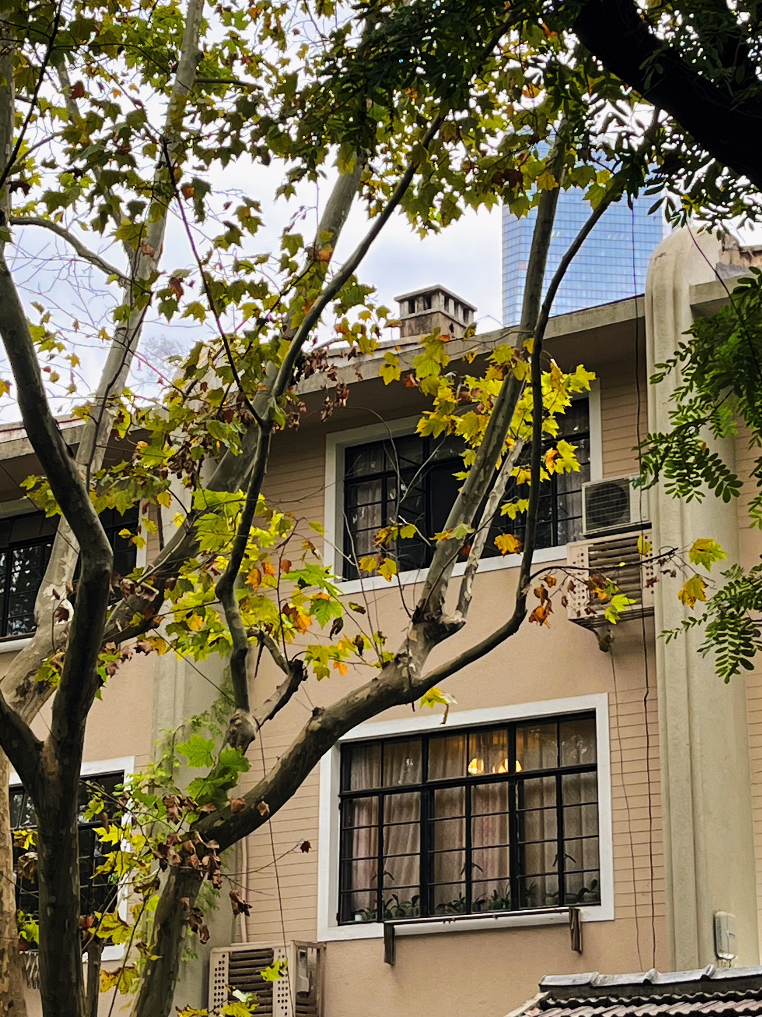 静宝在巨富长街区走了走,比起夏天的梧桐绿意,如今梧桐叶虽未完全变黄,但已明显呈现暖色调。
