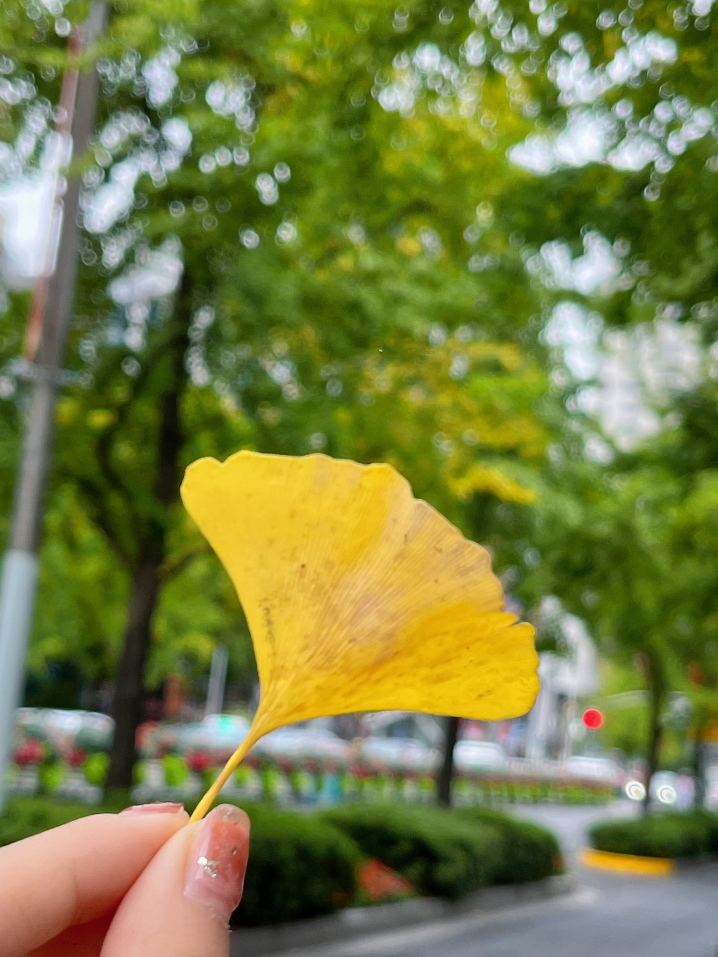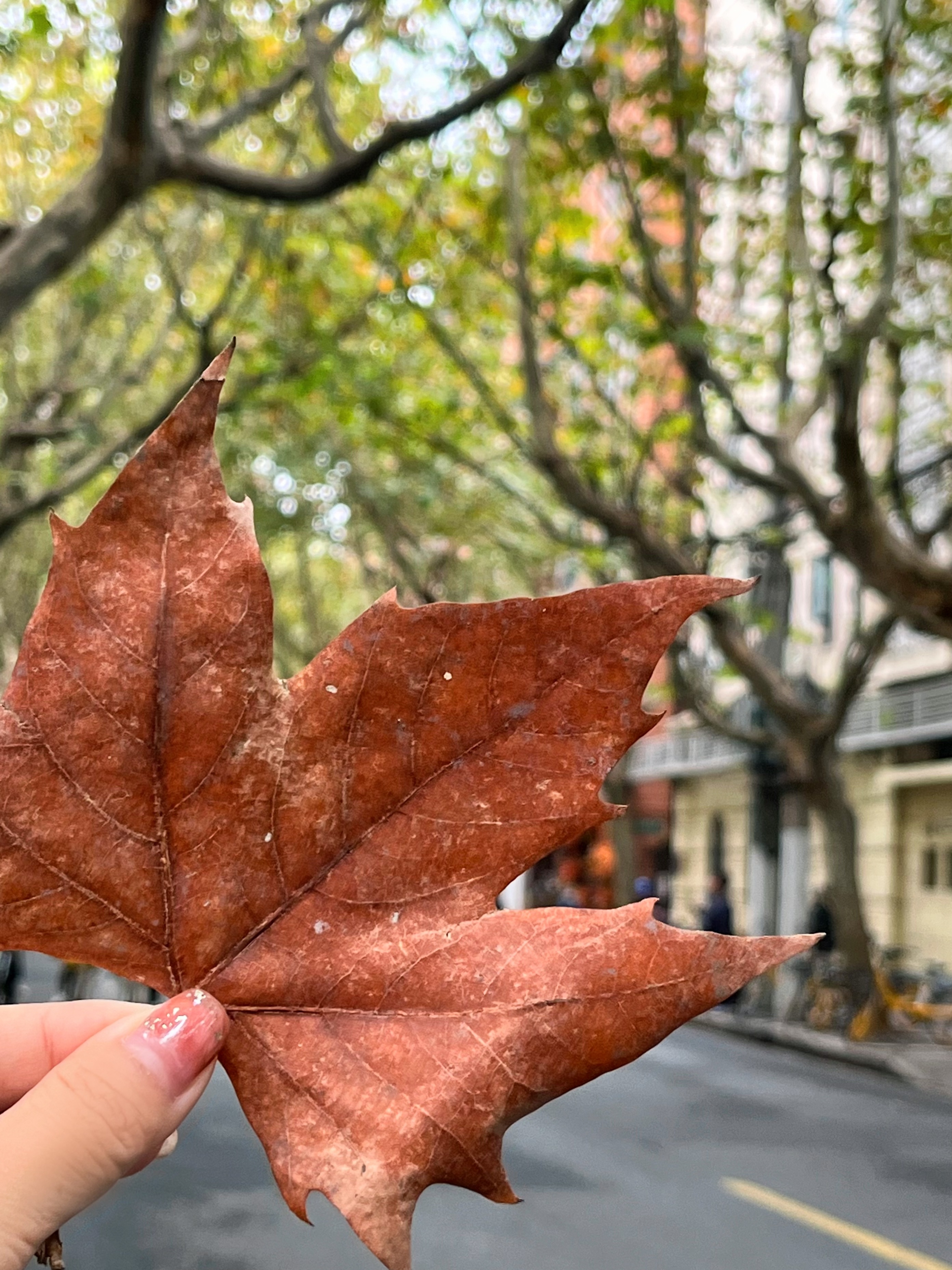 一阵风吹过,棕色的落叶优雅地打着圈,飘落在马路上,组成了上海秋冬的一道风景线。