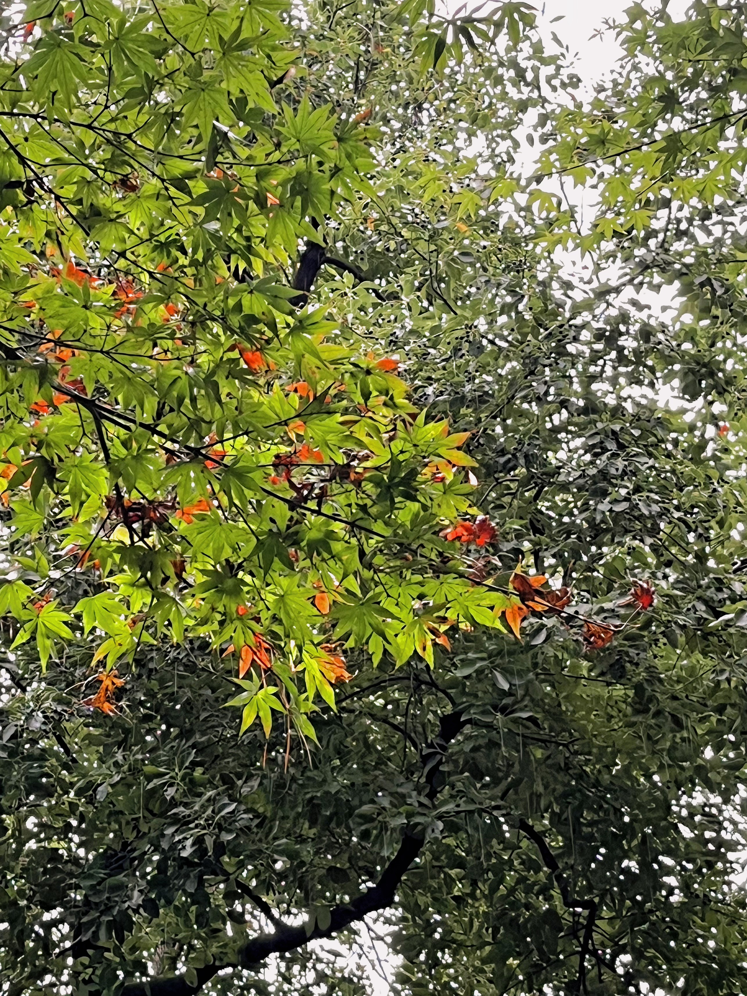 一些叶子被大自然绘上了红绿过渡自然的渐变色,在细雨中美得如梦似幻。