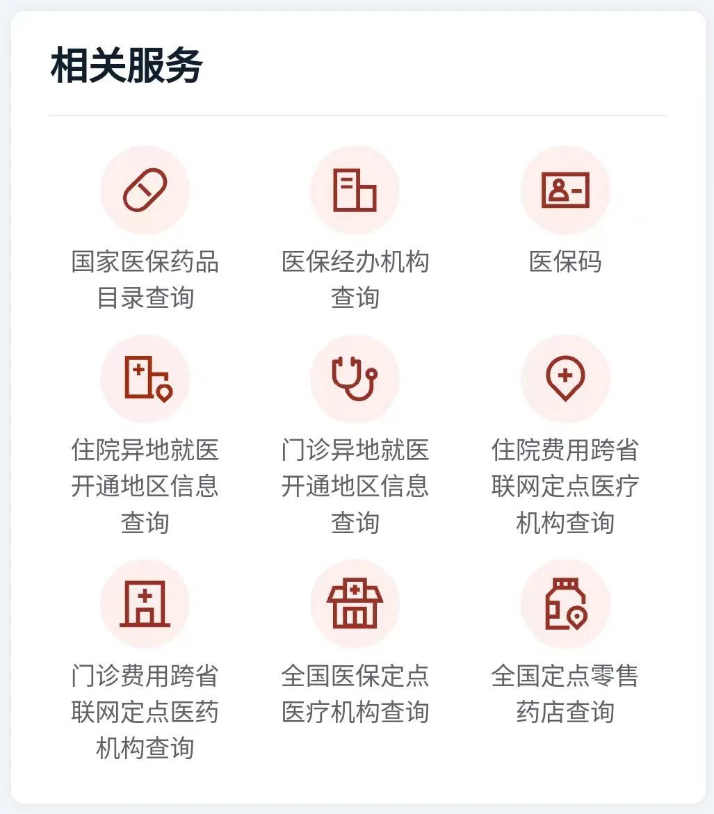 国家医保药品目录查询、医保定点医疗机构查询、全国定点零售药店查询……更多相关服务也帮你“打包”好了!