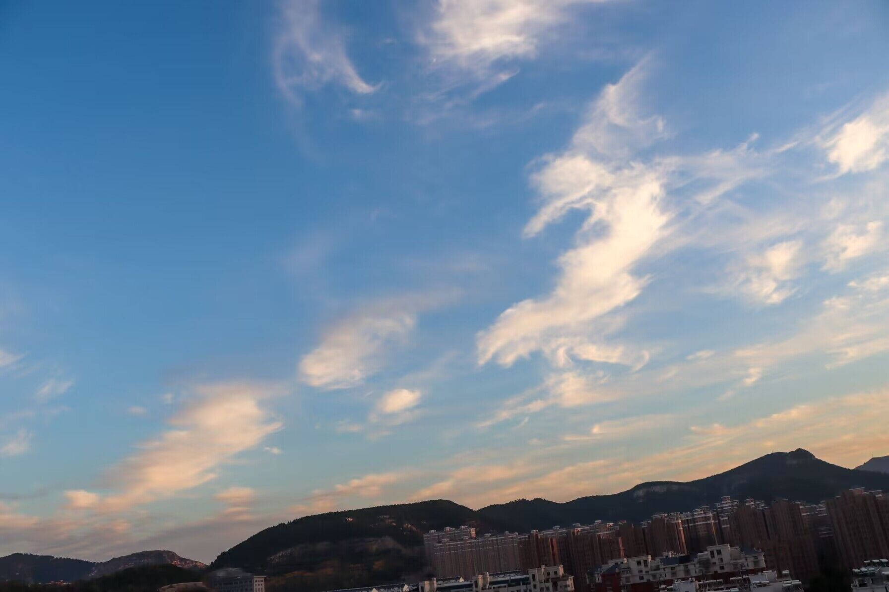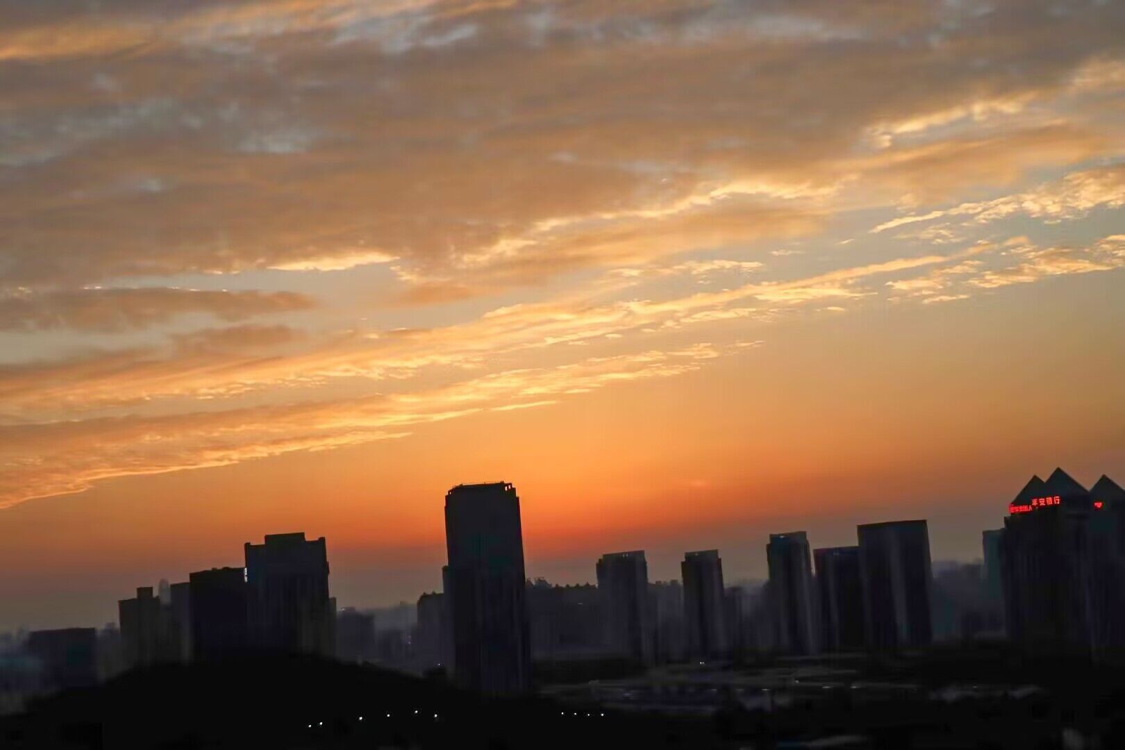 11月13日,济南黄昏时分,群山之外,夕阳晚归,五彩云霞映红天际,充满诗情画意。(大众日报客户端记者 武宗义 报道)