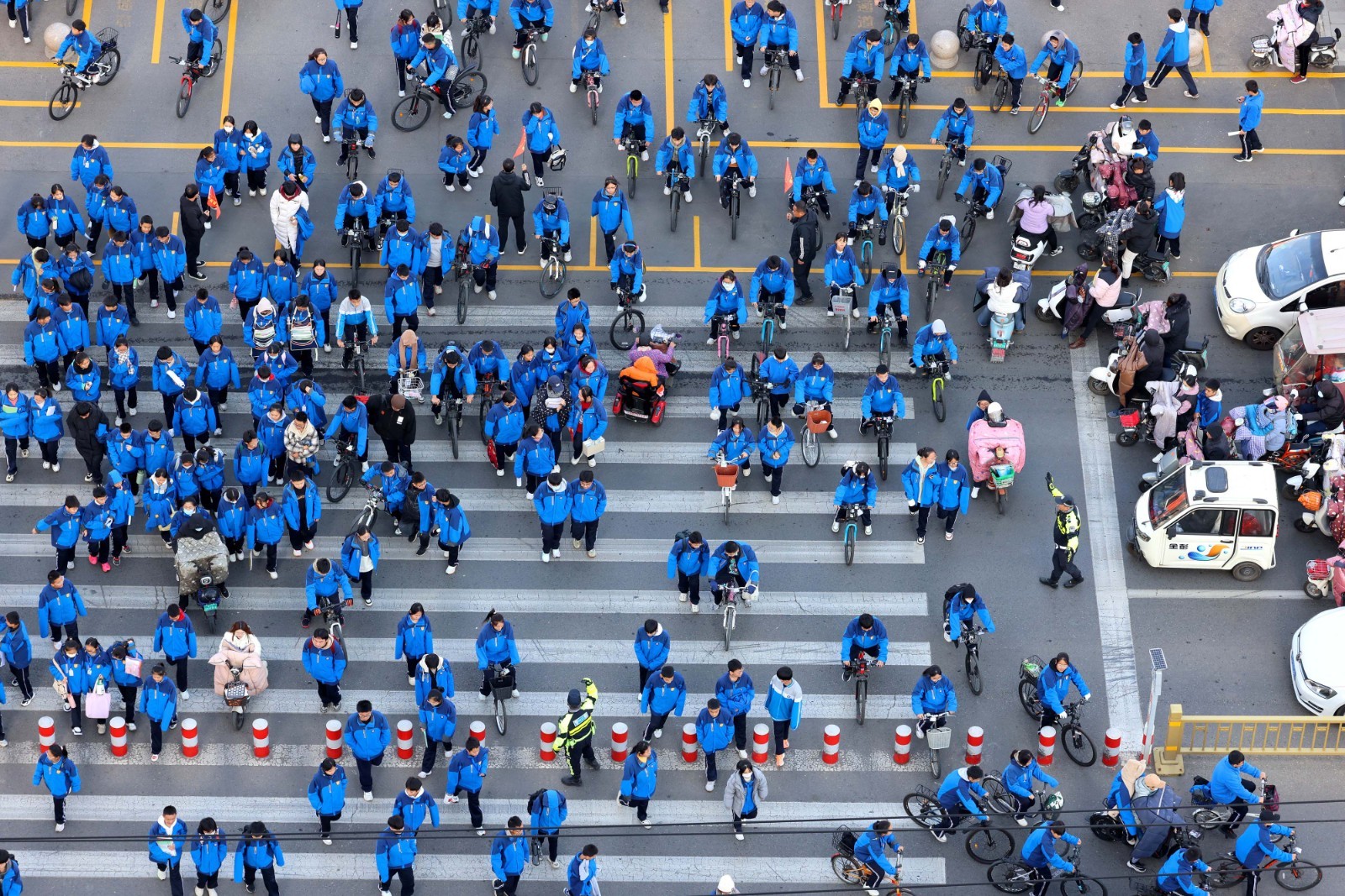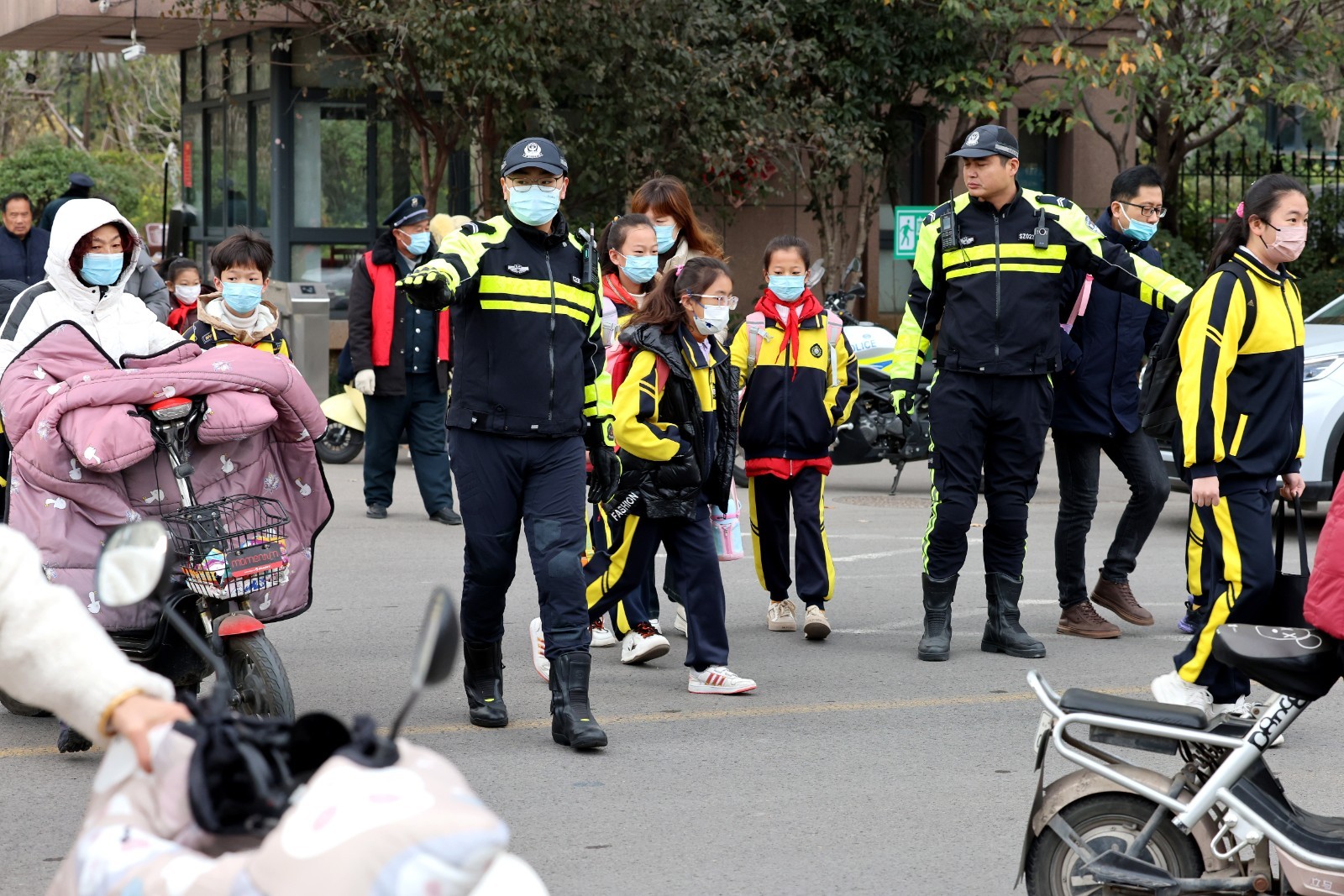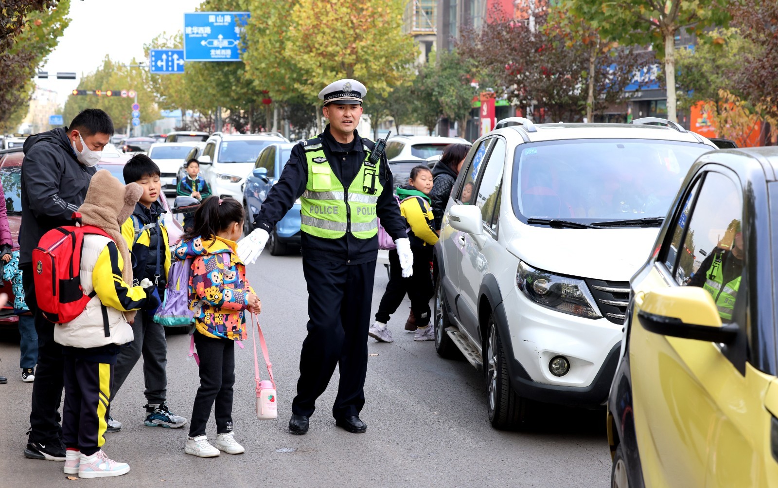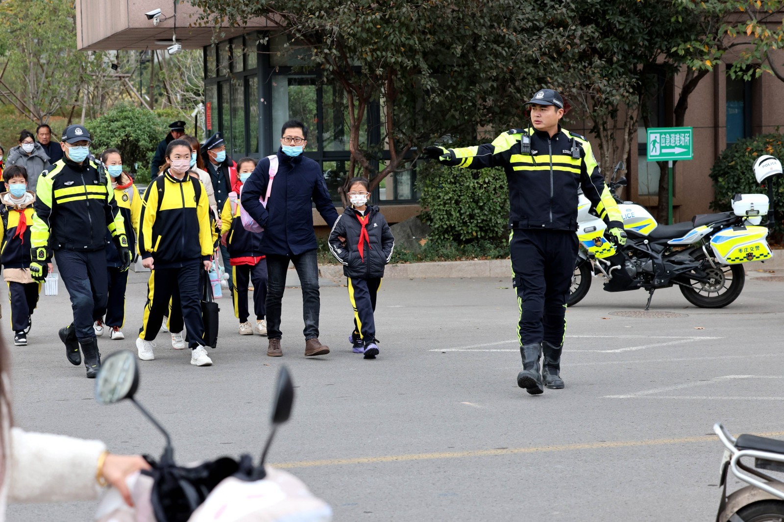 11月13日,枣庄市公安局市中分局交通警察大队民警在当地东湖小学附近重点路段护送学生过马路;铁骑队员在枣庄市第四十一中学门口维护交通秩序,护送学生过马路;在东湖小学附近重点路段护送学生过马路。