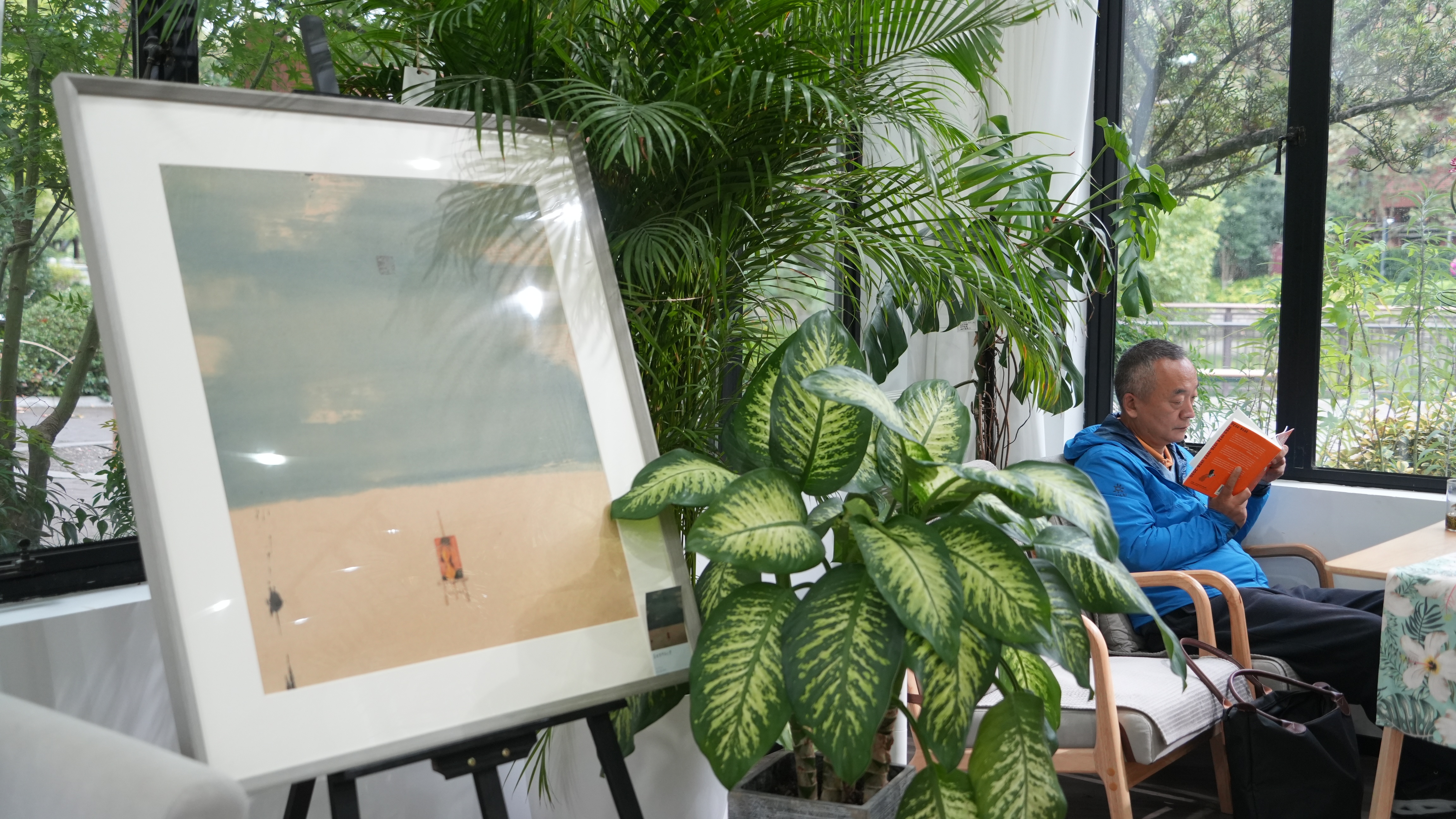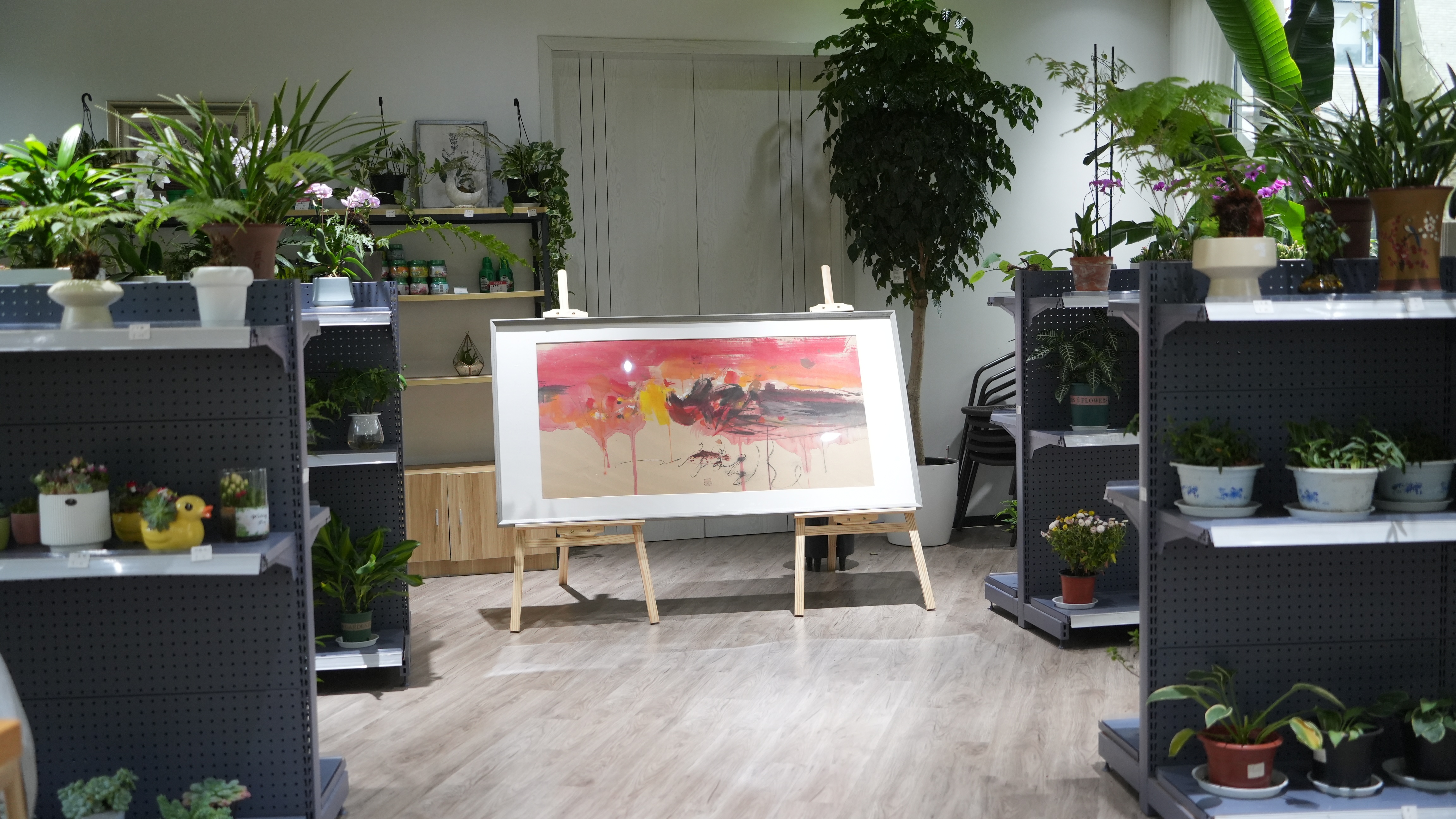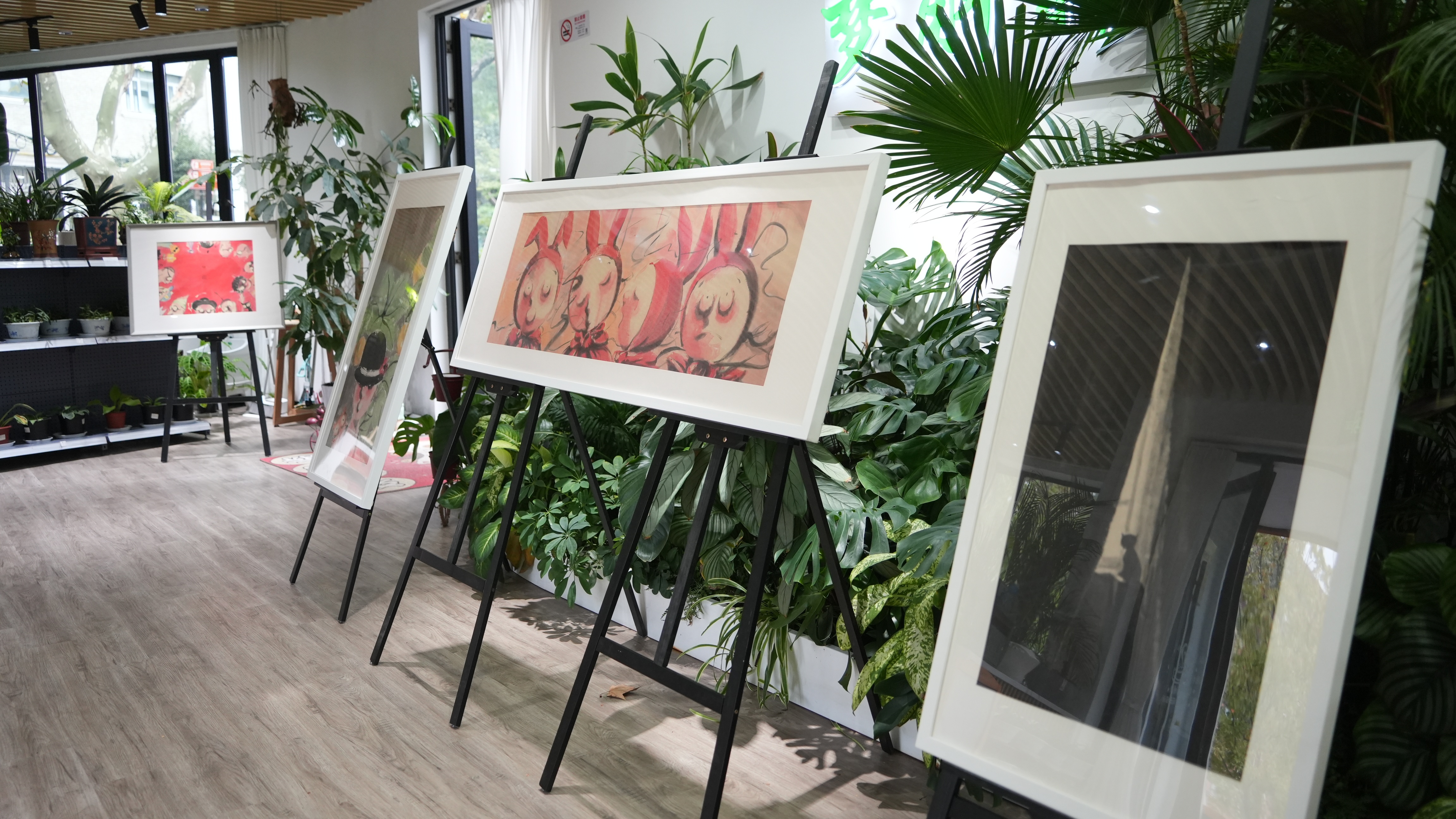 在闸北公园园艺中心,艺术家曾勇带来了他的多部画作,园艺中心摇身一变,成为了画展现场。一幅幅作品布置在花草之间,为园艺中心带来了满满的艺术氛围。