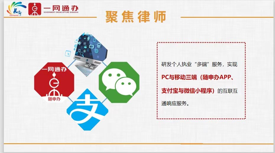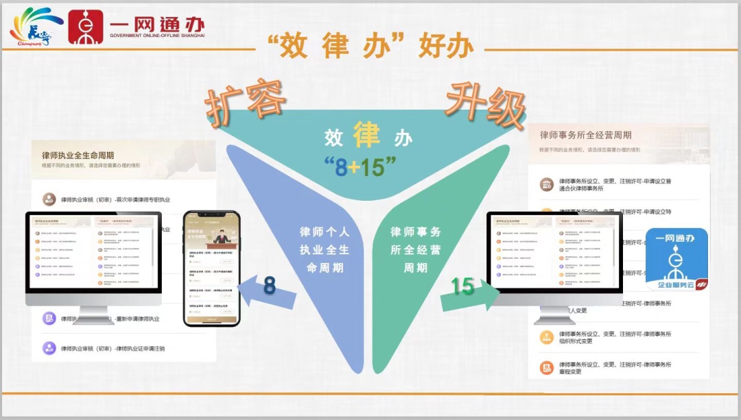 长宁区司法局还着力打造律师行业政务服务“效律办”全新品牌,即在实现律师个人执业许可在线申办基础上,通过前置业务在线办理专区,开发多人“在线联办”功能、实现证照在线授权使用、完成一键电子归档、推动“在线取证(照)”等数字功能,有效打通律师事务所许可业务在线办理的工作闭环,创建全市唯一行业领域数字化行政许可全流程闭环式在线办新应用场景,大大提速律师业行政许可申办响应度、业务办理便捷度与智慧政务精准度,有效回应与妥善解决了以往律师业执业许可中的各类痛点、难点问题。