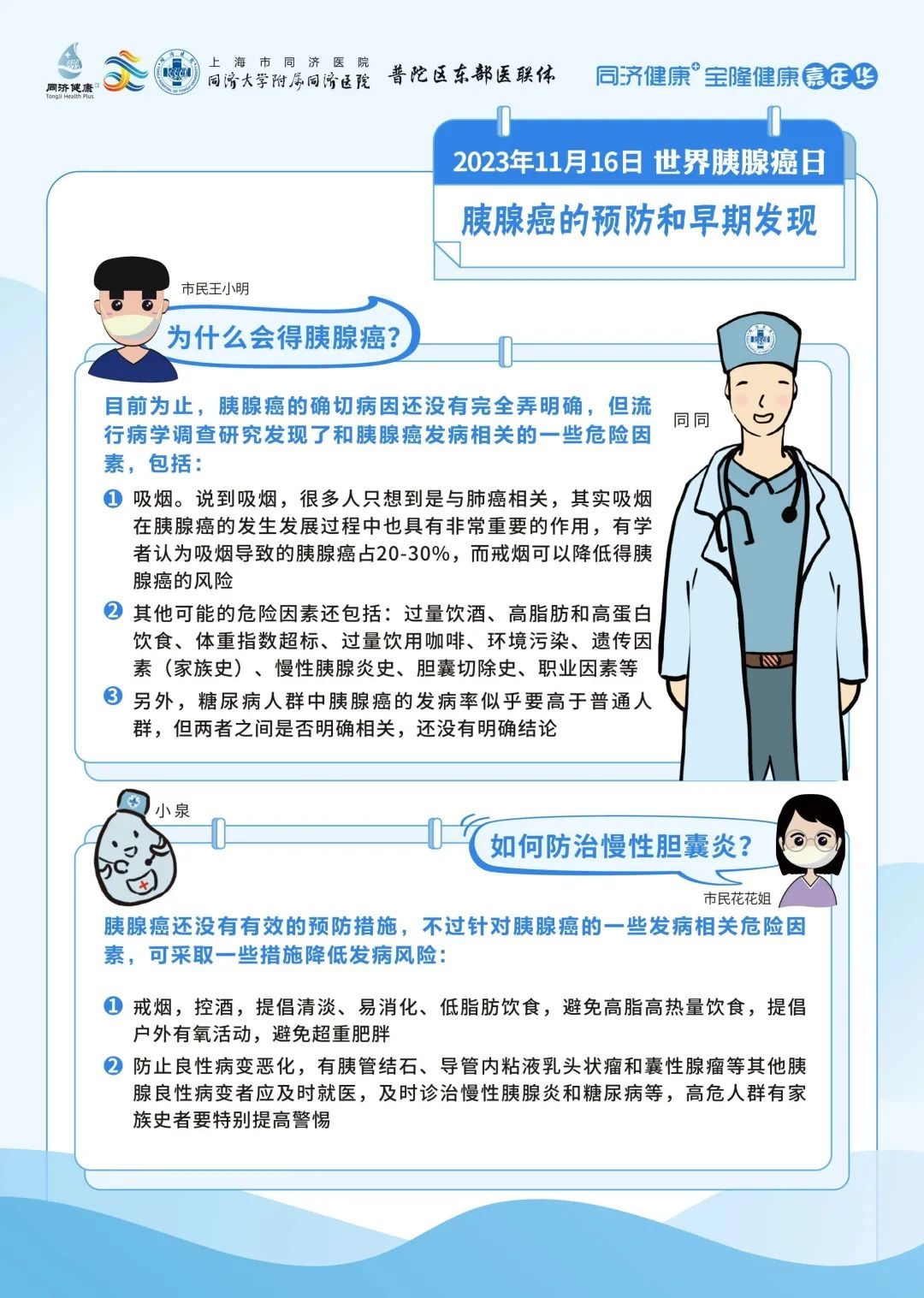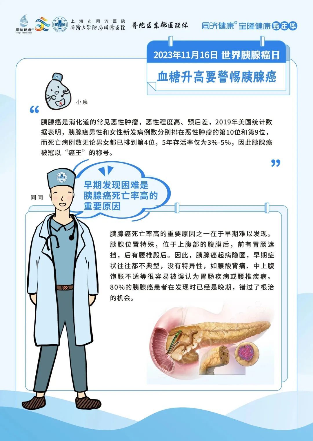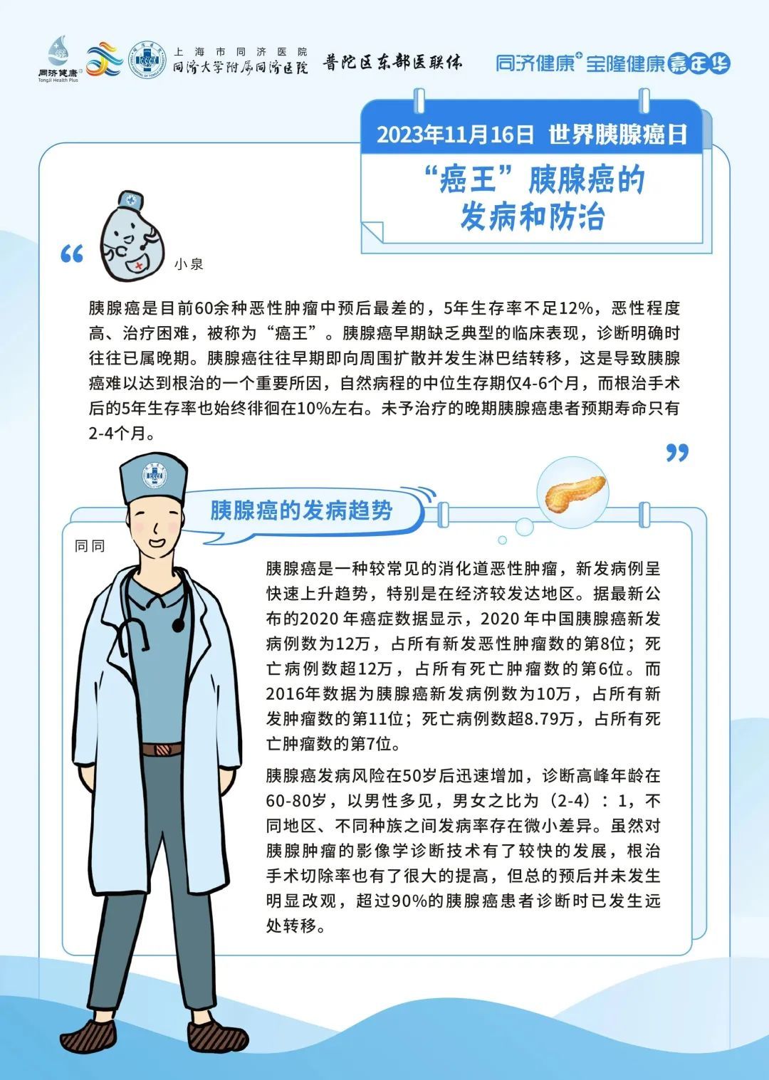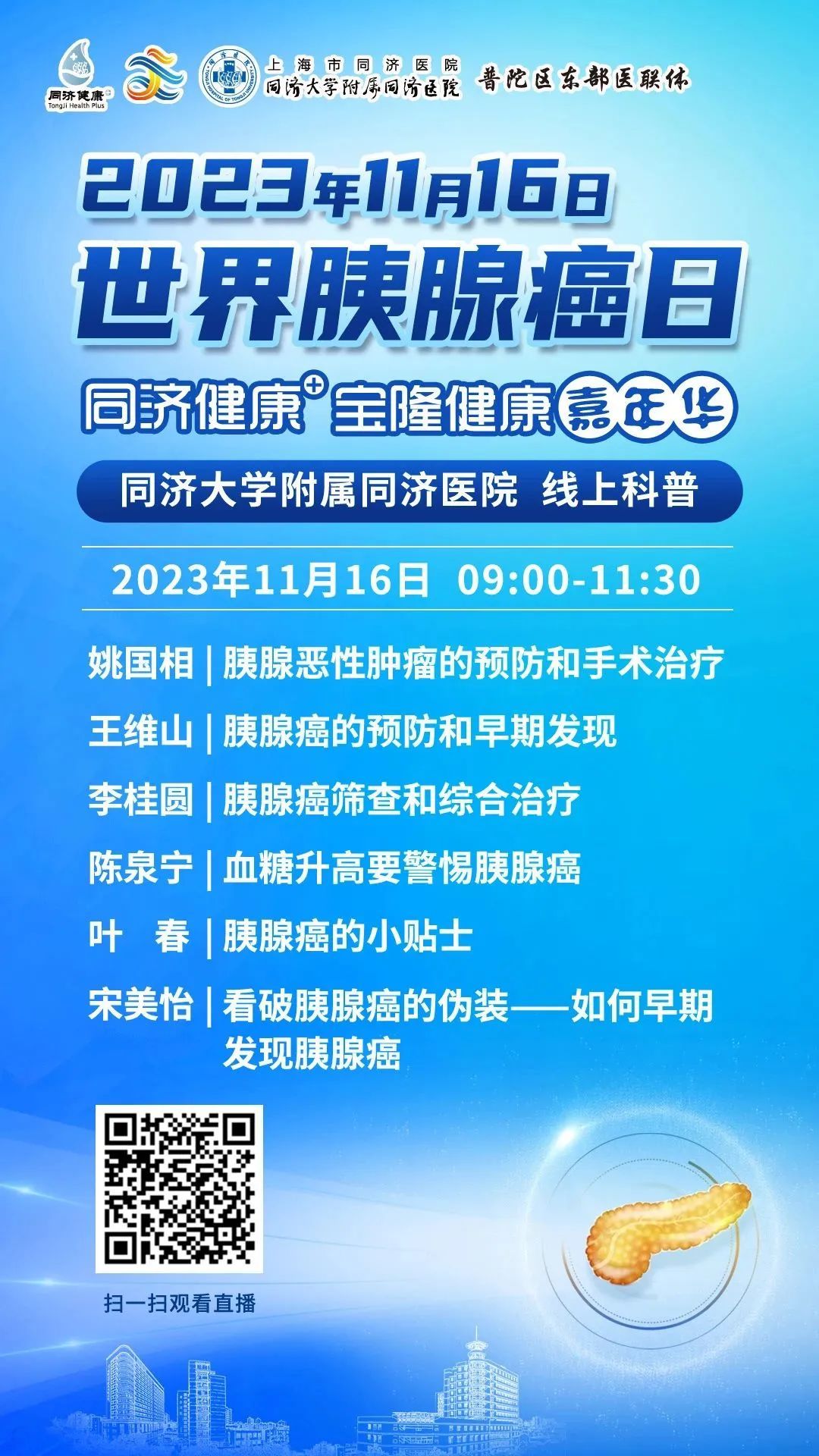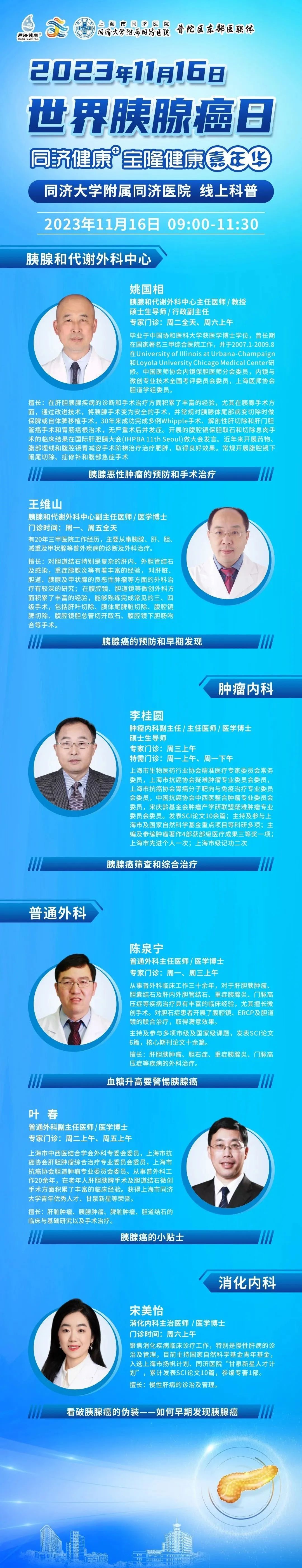 同济大学附属同济医院将在2023年11月16日上午9:00进行【世界胰腺癌日】科普直播。来自胰腺和代谢外科中心、肿瘤内科、普通外科以及消化内科的6位专家将从不同的角度科普胰腺癌相关的防治。