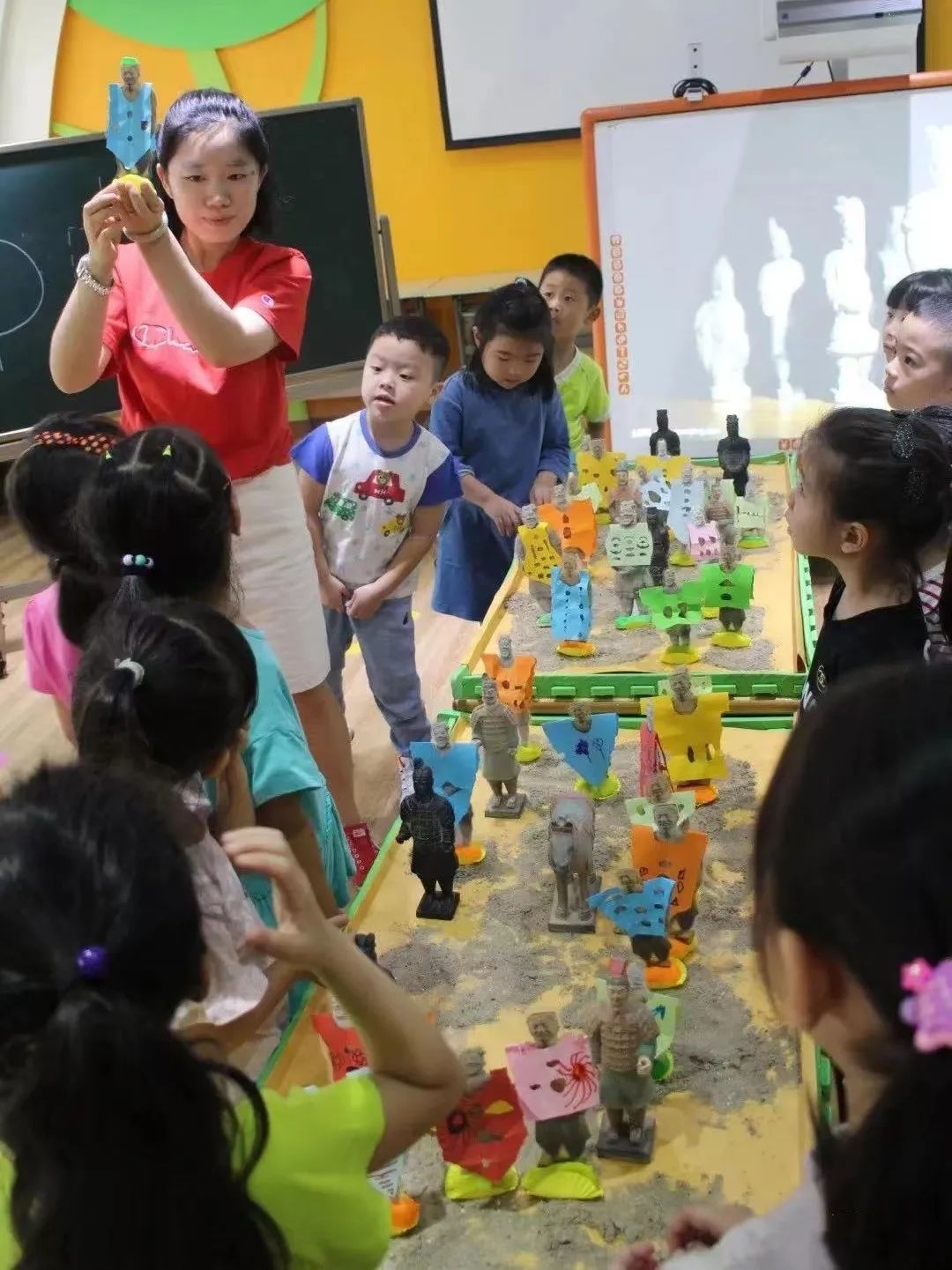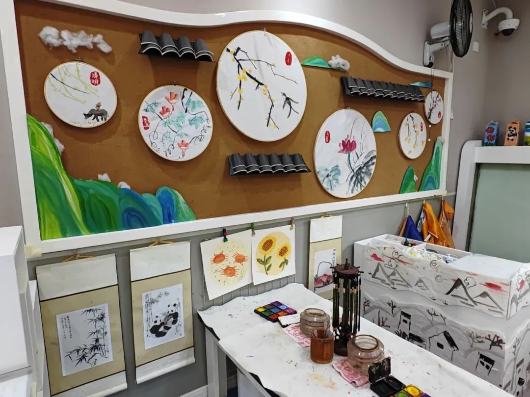 在新剑,传统文化的流淌与传承,远不止于撕纸。走进新剑幼儿园的美工室,轻泥与一次性餐盒粘成的“青花瓷”、水墨晕染的山水虫鸟画、水彩绘就的各色脸谱,目光所及处处浸染中国传统文化的气息。