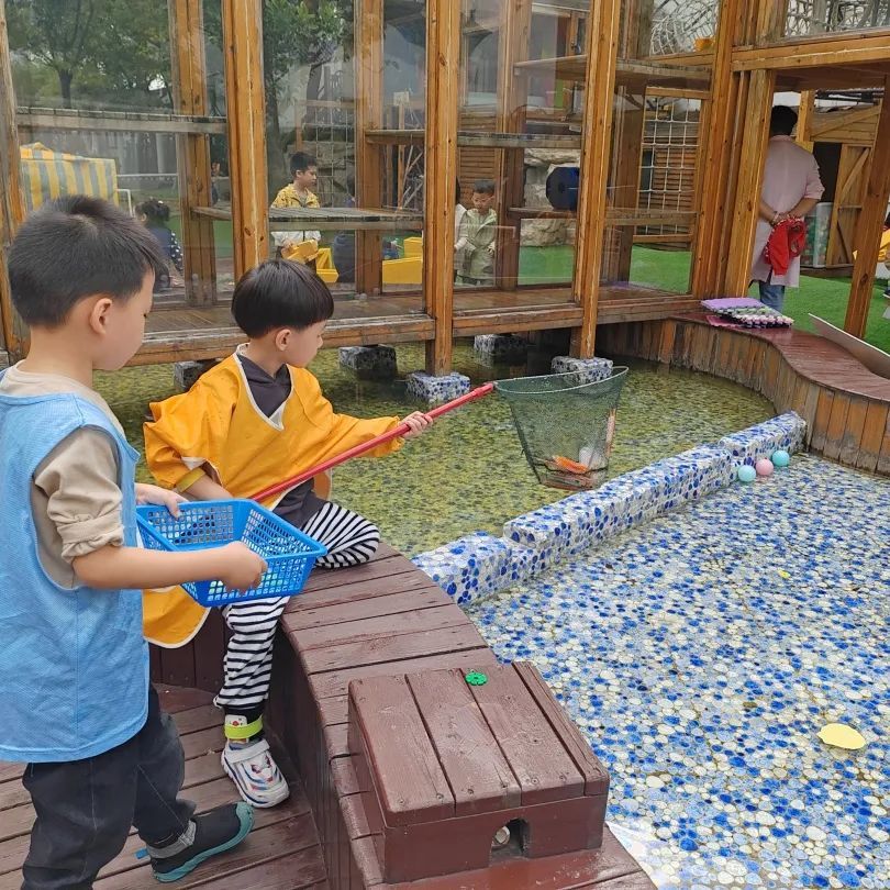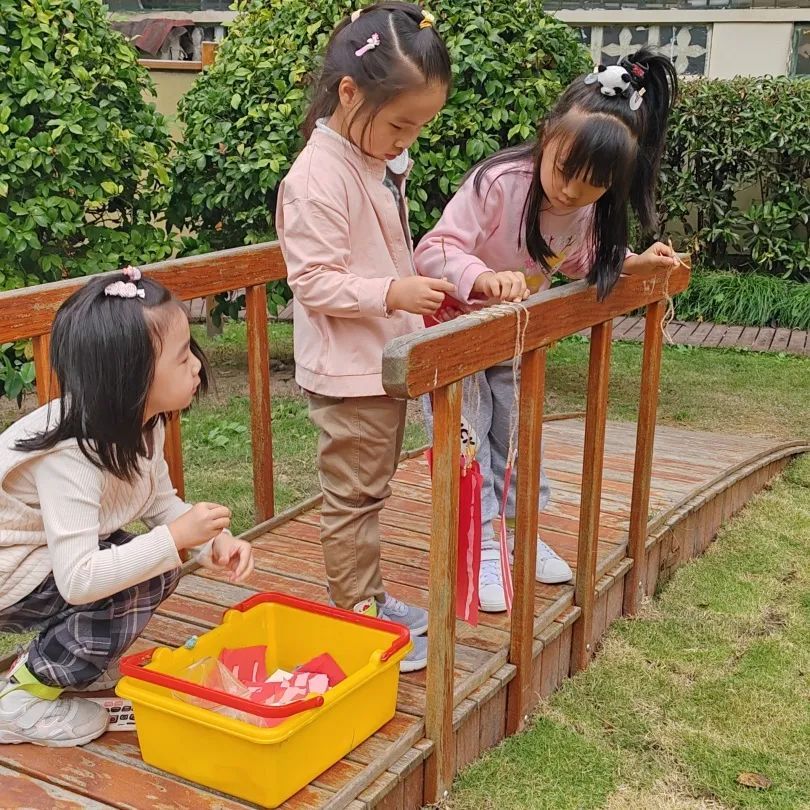 一张普通的红纸,在指尖转一转、折一折,撕成一条条灵动的小鱼,把小鱼塑封好放在水塘里,拿起鱼竿“钓”个尽兴;红纸撕成条状,粘上粉色碎纸片,一根细绳挂起红粉相间的纸片,“晒腊肉”活动就完成了;撕碎的“宝石”埋进大大的沙坑,“寻宝游戏”正式开始!两只小手挖呀挖,挖出了多彩的童年......