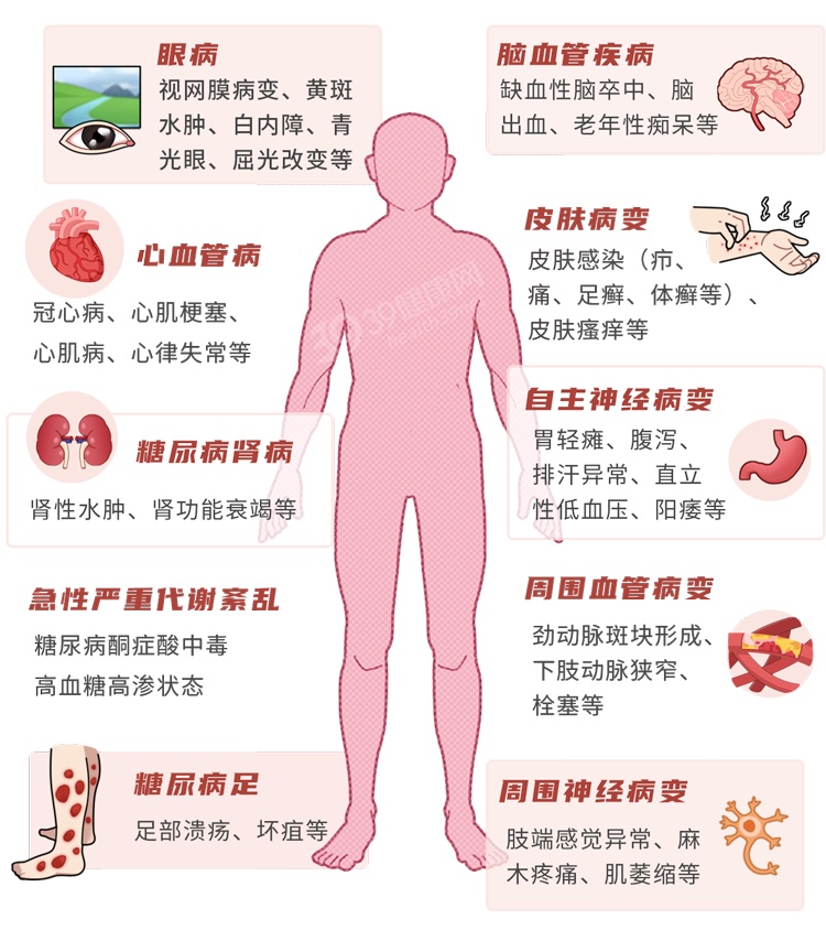 生殖系统:糖尿病还可能影响男性和女性的生殖健康。男的出现勃起功能障碍,女的月经不调或影响生育。