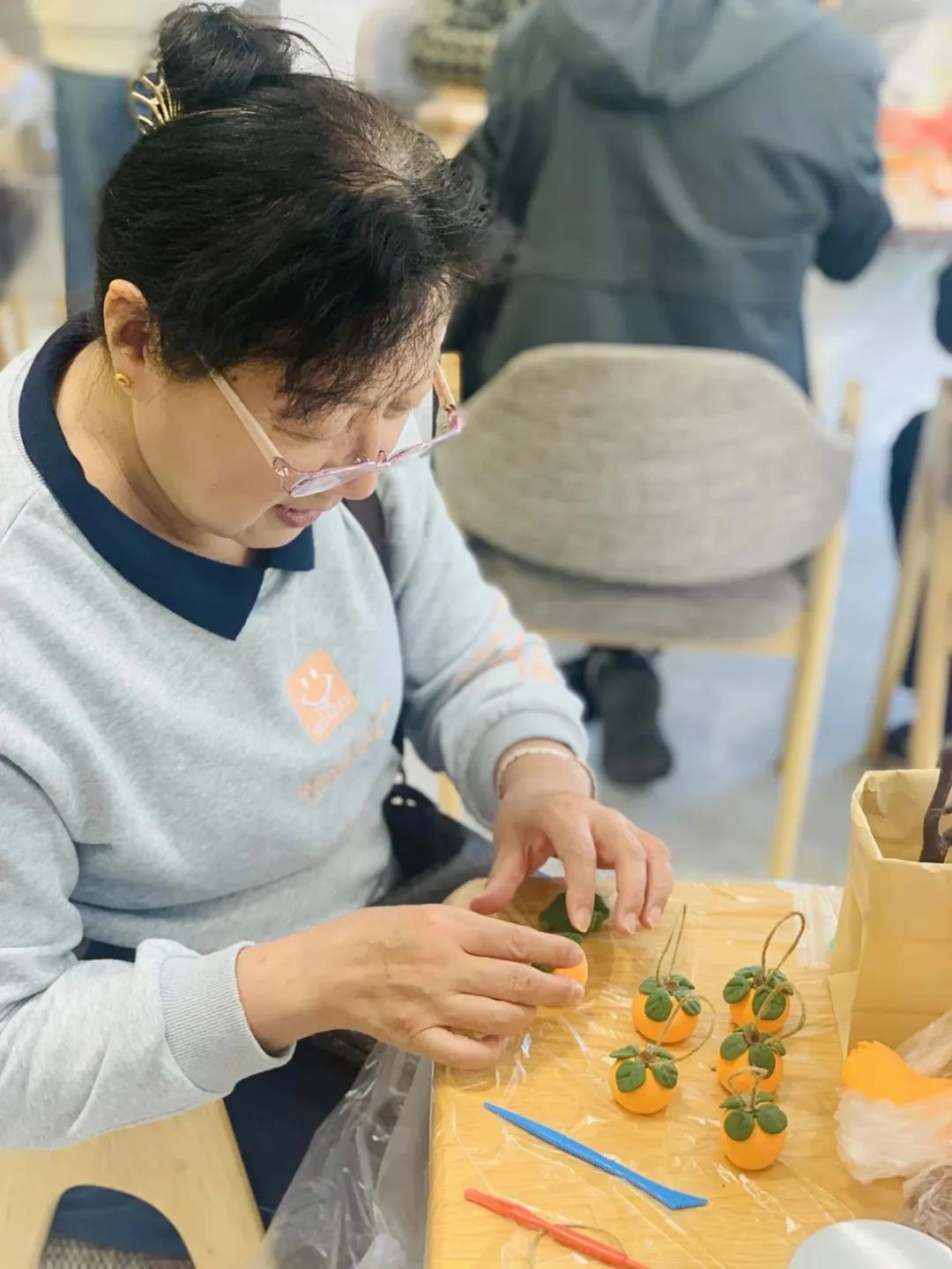 随后,大家跟随社工一起制作粘土柿子树。柿子在中国传统中象征着丰收和好运,柿子的柿又与“事”同音,也常用柿来比喻好事成双、事事如意等。大家一边说笑着,一边制作粘土柿子,不一会儿,一个个漂亮的柿子就制作成功了,最后亲手写上福字,一棵温暖的柿子树完成了。