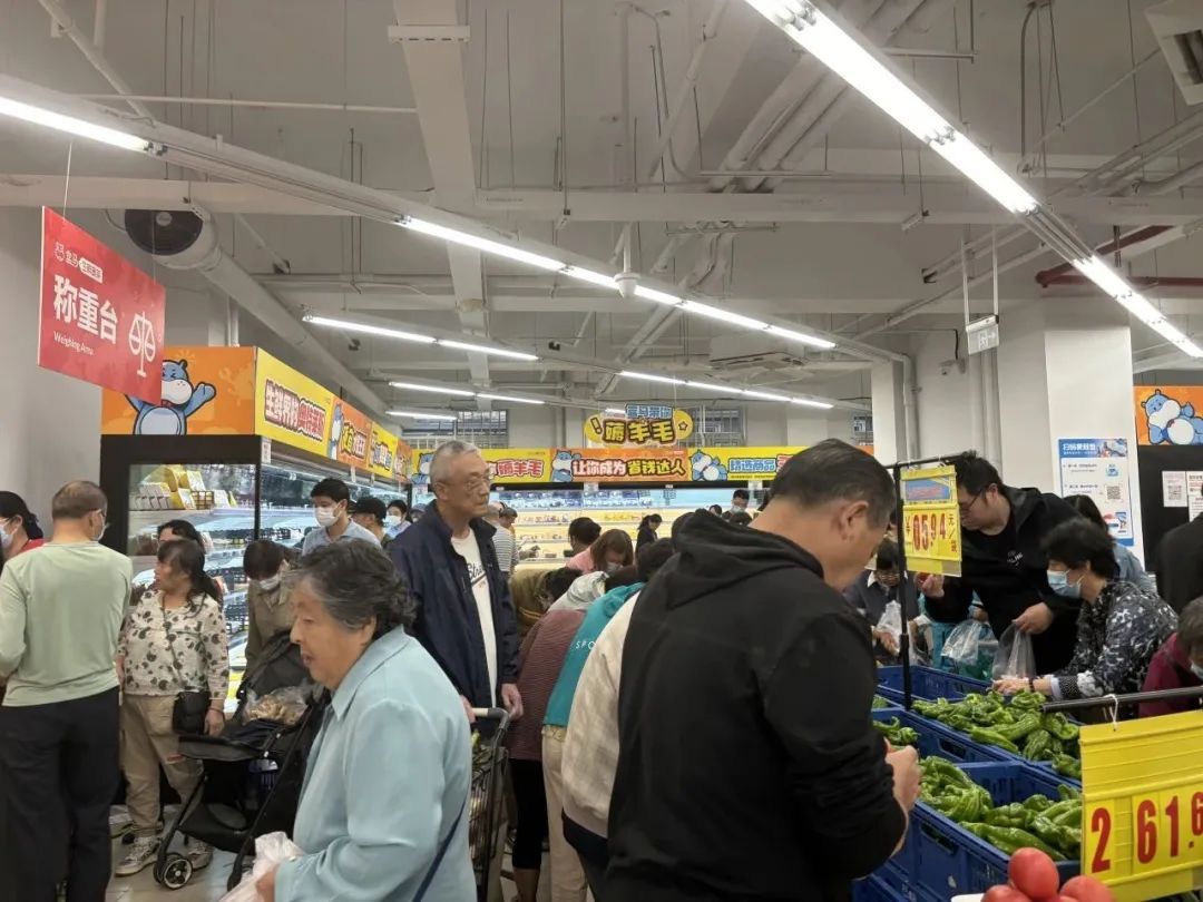记者注意到,即便是工作日,这家店里依旧人头攒动。在店铺中央的散货区,当日特价商品西红柿、土豆和生姜,刚摆上货架还没贴价格,就引得一群爷叔阿姨们一拥而上,“反正再贵也比外面便宜,这家店不需要看价格。”一位正在挑选生姜的阿姨头也不抬地告诉记者。