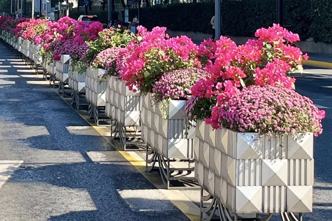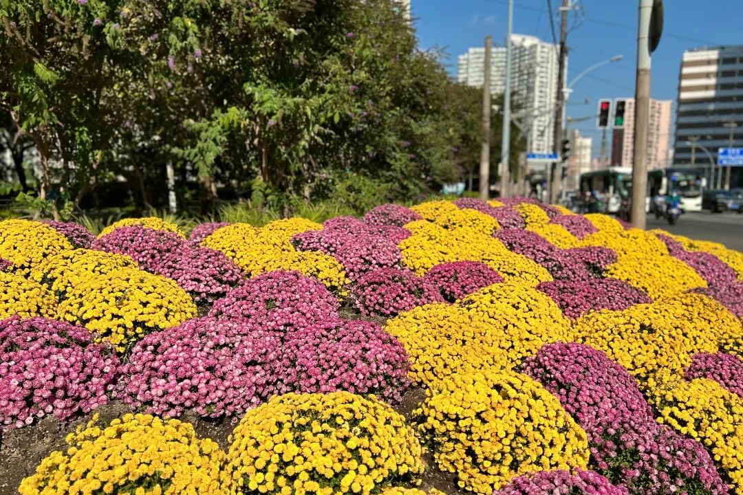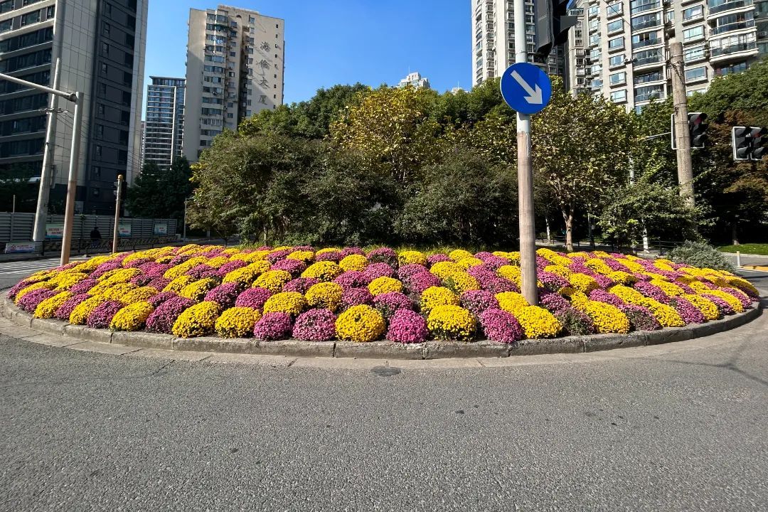 在海伦路周家嘴路路口,紫红色的球菊高贵神秘,黄色的则更显明亮温暖,两种颜色相互交织,在绿色的树木背景形成鲜明的对比,为街头增添了无尽的色彩与活力。