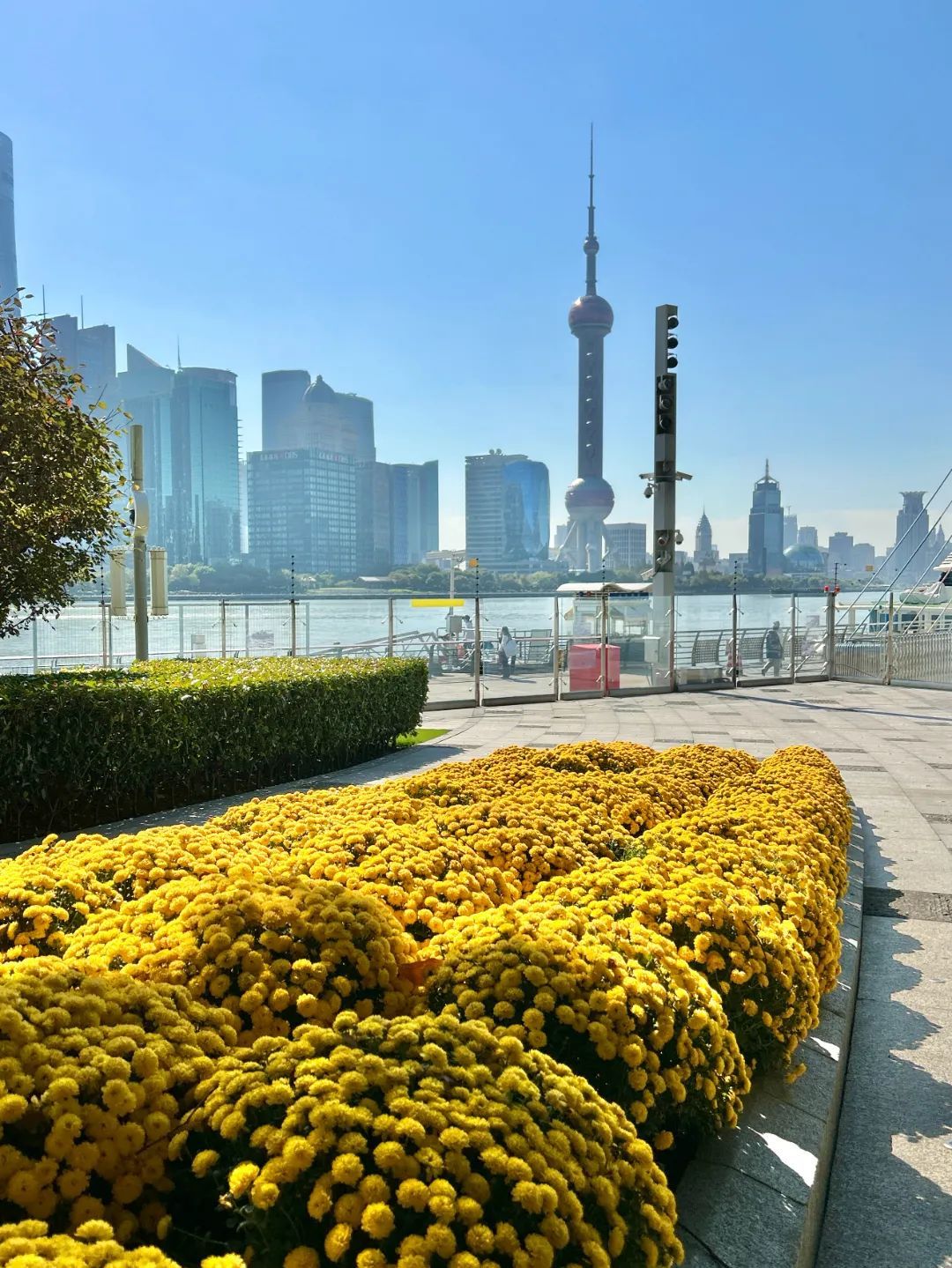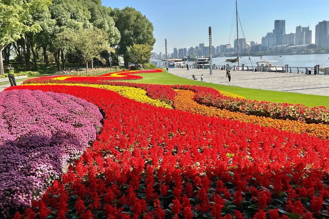 北外滩滨江置阳段依然主打飘逸灵动,主要种植了球菊、一串红、海棠花、孔雀草、美人蕉等植物品种,犹如一条条斑斓的飘带,又似起伏的海浪般绵延不绝。