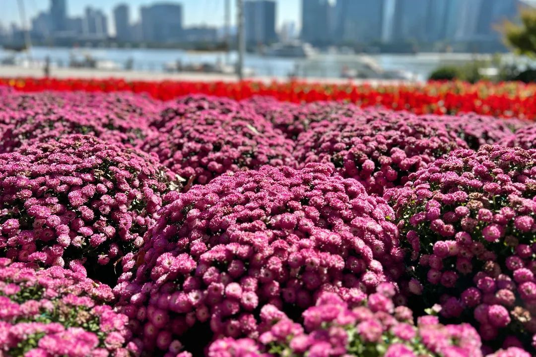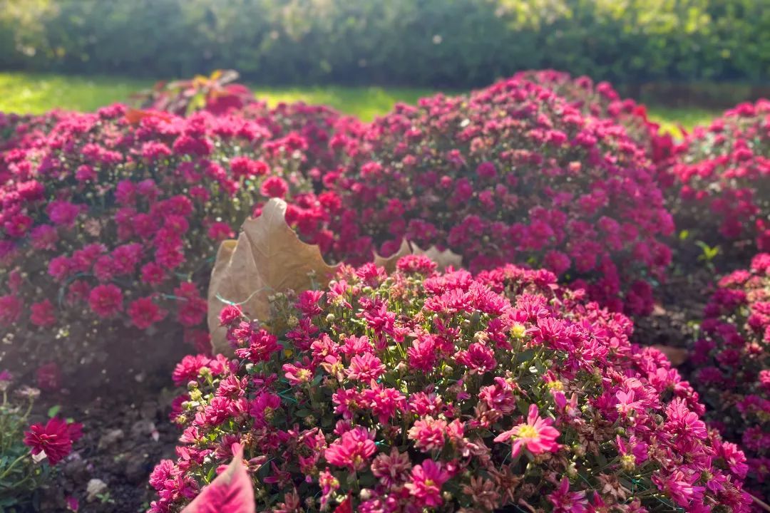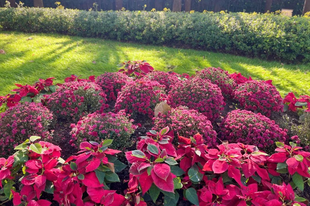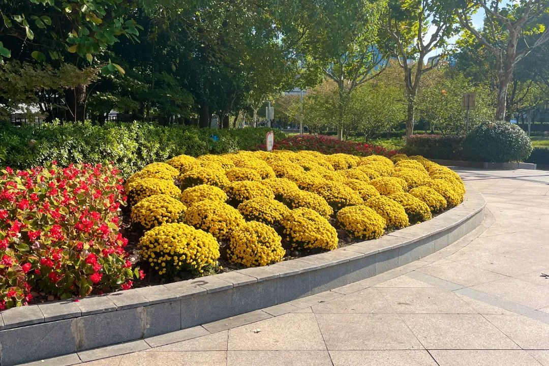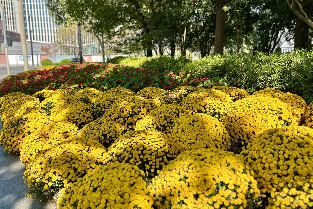 新建路沿线也有不少用球菊和其他花卉搭配的花境,深秋的阳光下,这些小巧玲珑的花朵格外耀眼。每一朵花瓣都格外细腻而精致,犹如一件件艺术品。