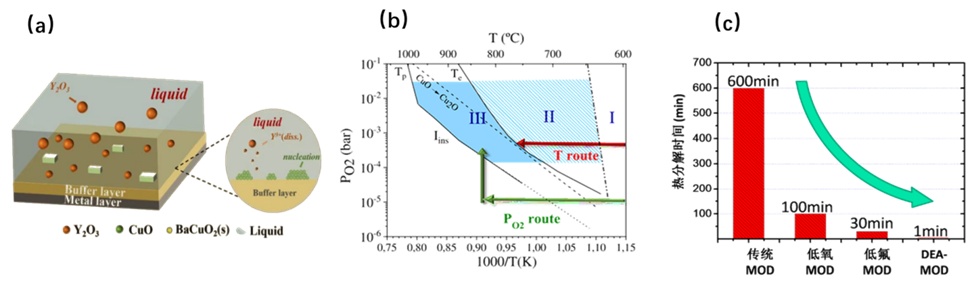 化学法超导膜高效生长(a)液相辅助成核生长机制;(b)相图与工艺控制;(c)成材效率大幅度提高(参见蔡传兵等《物理学进展》(特邀综述)27, 467(2007);《科学通报》(特邀综述)64, 827(2019))