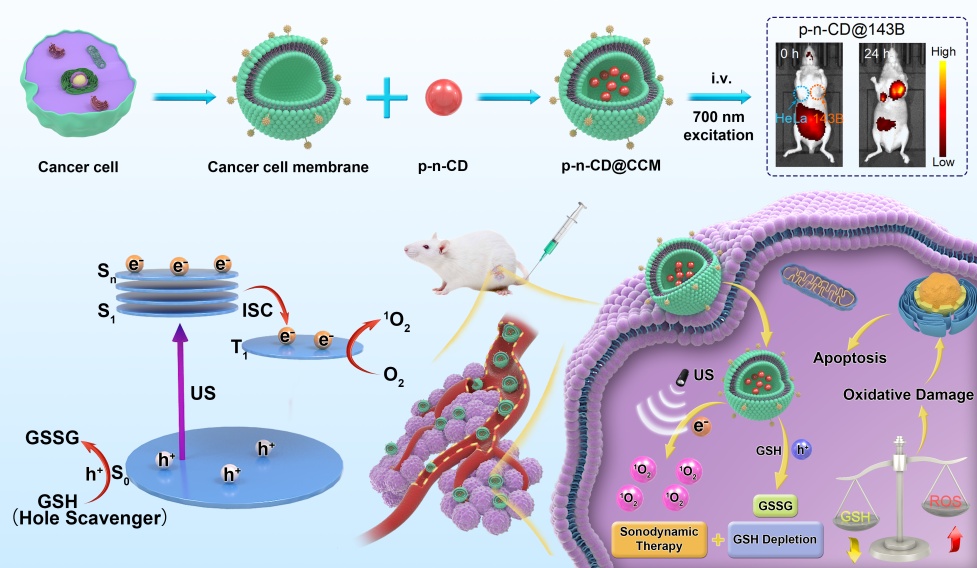 制约声敏剂临床转化的瓶颈在于:(1)电子-空穴对的复合导致声动力活性的严重下降。(2)纳米声敏剂在体内长期富集导致安全隐患的问题。本项目创建诊断与治疗为一体的多功能碳点纳米医学平台,将为肿瘤精准治疗提供了全新的范式。