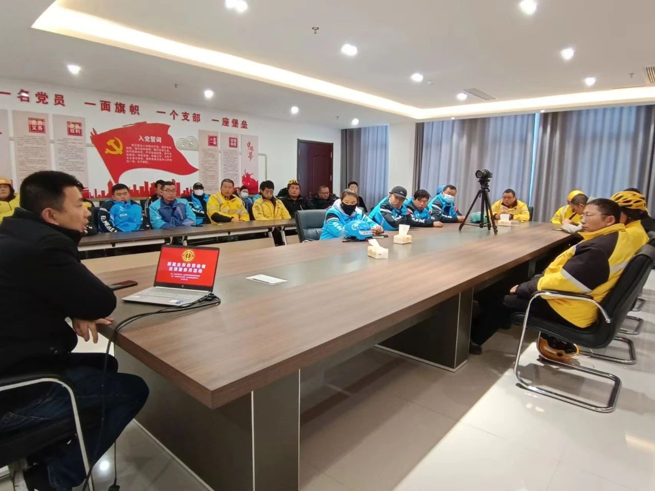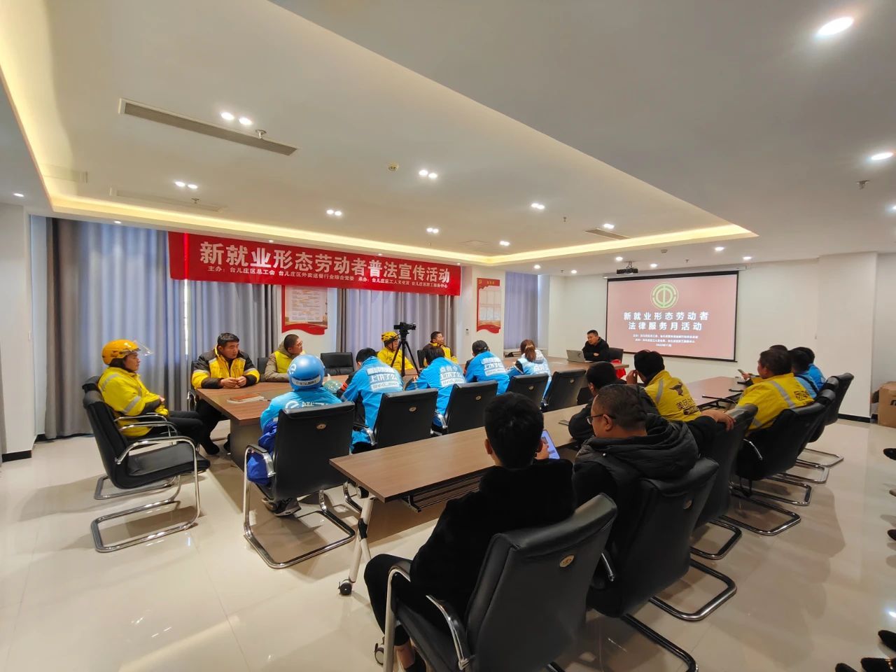 11月14日,枣庄市台儿庄区总工会组织举行了新就业形态劳动者普法宣传专题讲座,区内美团、饿了么公司的30余名外卖配送员参加活动。