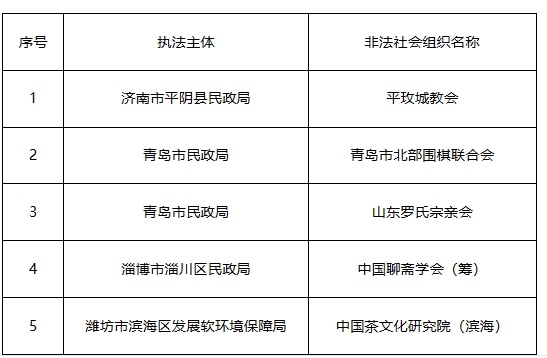 为进一步加大对非法社会组织的打击整治力度,充分发挥社会监督作用,近日,山东省民政厅向社会集中公布一批依法取缔、劝散的非法社会组织名单,请社会公众提高警惕,避免上当受骗。社会公众如果发现名单中的非法社会组织仍在开展活动的,可依法向公安机关报案。