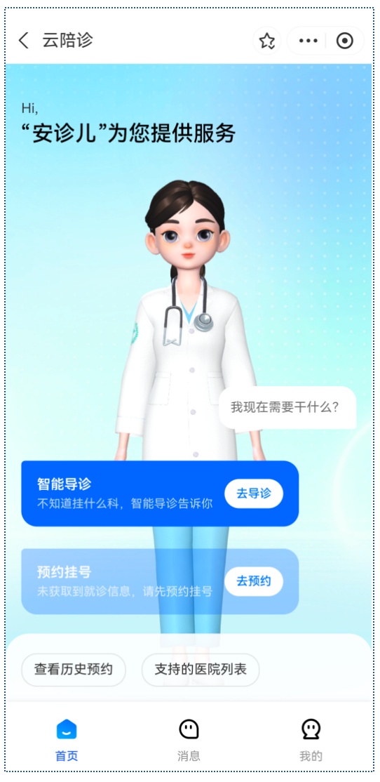 数字健康人“安诊儿”不仅可以给出挂号建议,还可以直接提供挂取号、签到服务;就诊中,会协助患者进行就医规划,并提供流程指引、导航带路、报告查询、医保支付等服务;就诊后,还会为患者建立一份健康档案,让患者通过“安诊儿”即可在后续为慢性病复开方,让整体就诊更为方便。