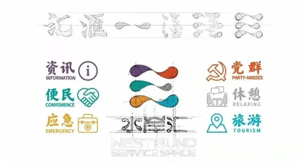 以“水岸汇,惠你我,共享卓越西岸新生活”为服务理念,按照“因地制宜、一站一品”的要求,徐汇滨江打造了“水岸汇”公共服务品牌,为市民游客提供六大功能。自2020年7月首个站点“云建筑站”开放至今,徐汇滨江已启用沿江公共配套服务品牌“水岸汇”服务点22处。 “水岸汇”LOGO由不同颜色的六个水滴组成一个“汇”字,既有地域特征,意指徐汇区的滨江地区;又代表了集“民生设施、休憩空间、充电设备、寄存服务、运动服务、资讯服务”于一体的六大服务功能;以及代表用心用情,满足市民群众点点滴滴需求的服务特点。