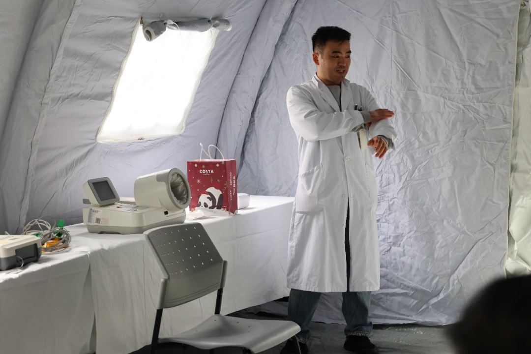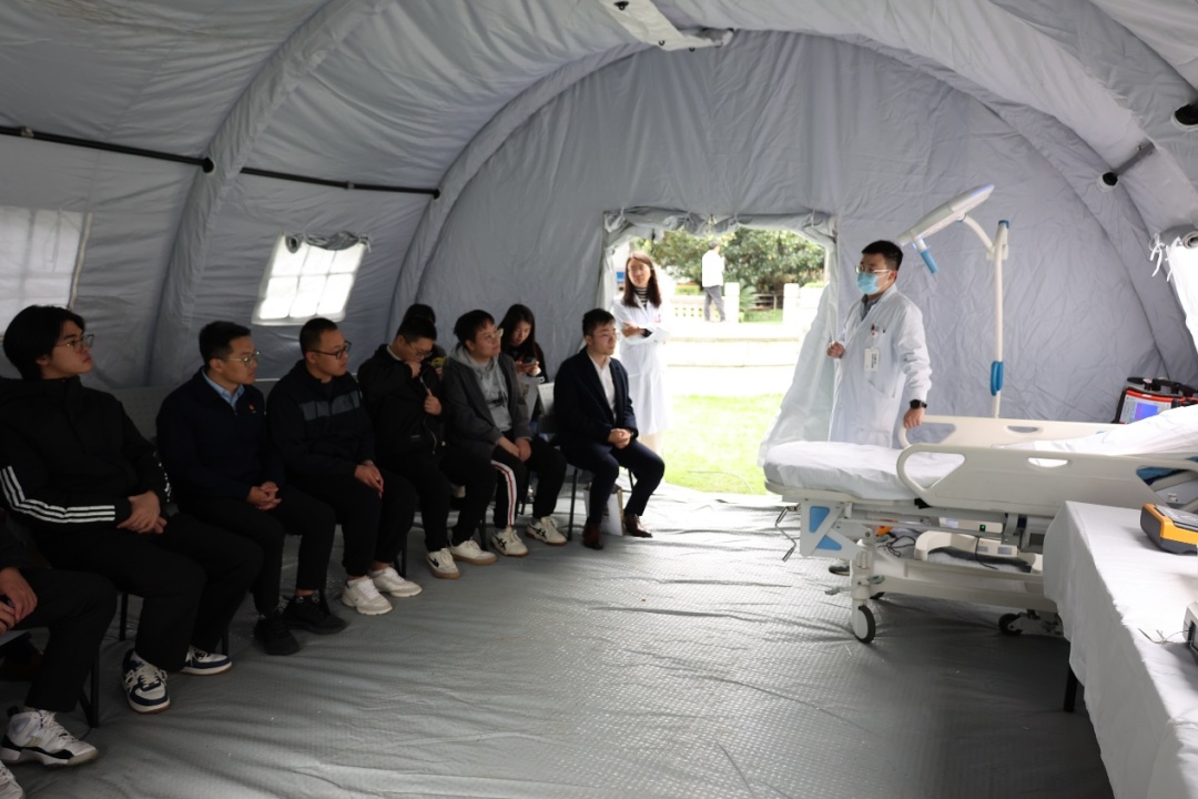 返回移动医院高压帐篷后,青年们发现帐篷里摆放了转运床、无影灯、监护仪、AED、辅助通气球囊、心电图仪、血压计等设备,一间移动医院高压帐篷病房展现在大家面前。张昂向青年们一一介绍设备的用途后,骨科赵广雷主治医师为大家做急救技能培训,包括外伤包扎和骨折固定等。