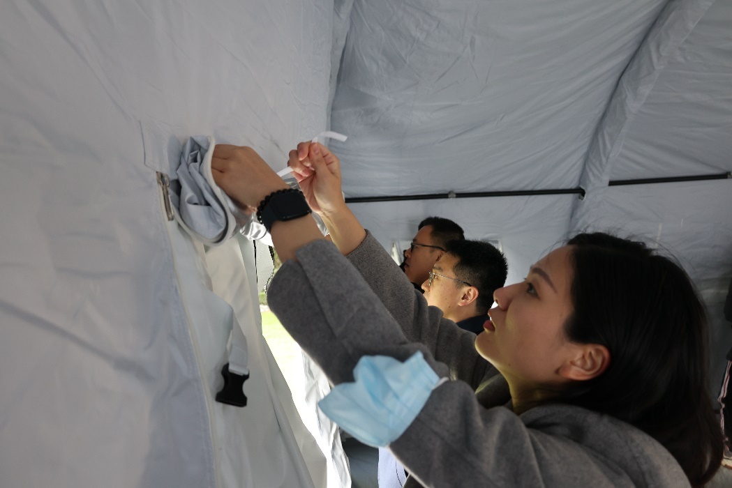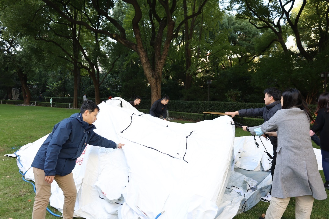 华山花园内,青年们在医务处应急保障科(移动医院)副科长张昂的指导下,演练搭建移动医院高压帐篷,它是紧急救援中不可或缺的设备,可在短时间内帮助医生迅速开展医疗救治。青年们配合默契、分工明确,拉帐篷、装支架、卷窗帘...齐心协力搭起一顶30平方米的移动医院高压帐篷,体验了医生在紧急救援下的速度。