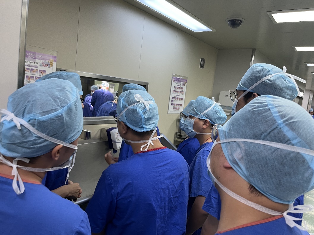 青年们分成两组,在无菌状态下先后进入手术室观摩微创外科手术腹腔镜操作。更衣室内,青年们换上全套装备,看着自己“准外科医生”的模样,纷纷拿出手机留念。随后,茅善华书记向青年们介绍手术室的分区及外科医生的工作,并在手术室外观摩、讲解正在进行的手术。