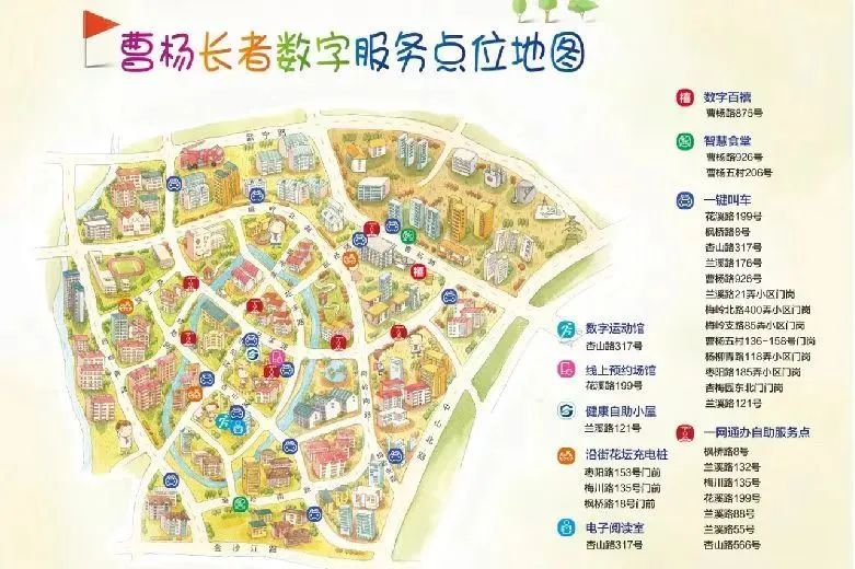 街道还将数字养老应用场景布局在“15分钟社区生活圈”上,制作“曹杨社区长者数字服务点位地图”。通过该地图,老年人可以查看附近的数字运动馆、数字食堂、沿街花坛充电桩、“一键叫车”智慧屏点位等,在家门口即可享受便捷、高效的公共服务。